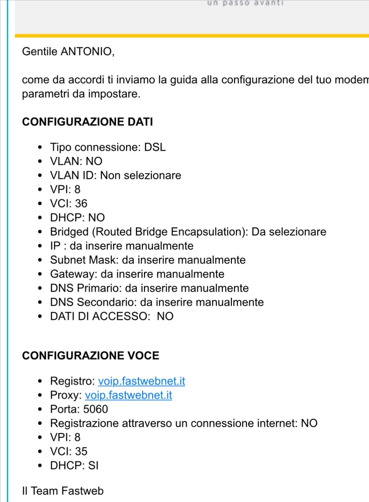 La Fastweb mi ha chiesto Mac adress che io ho fornito e mi hanno mandato questi parametri da mettere.