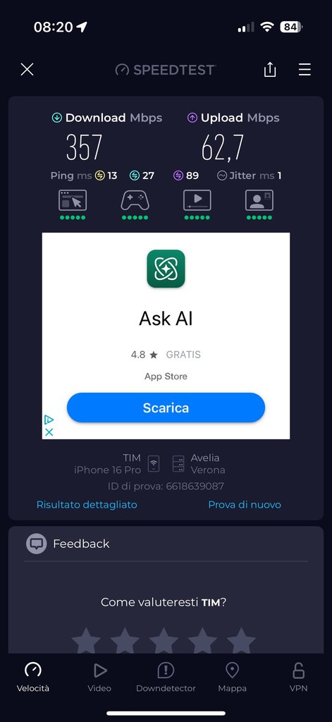 Ho poggiato l’antenna provvisoriamente sul davanzale con speedtest 359/62,7 13ms in attesa che mi si liberi il cavo di Eolo sul tetto.