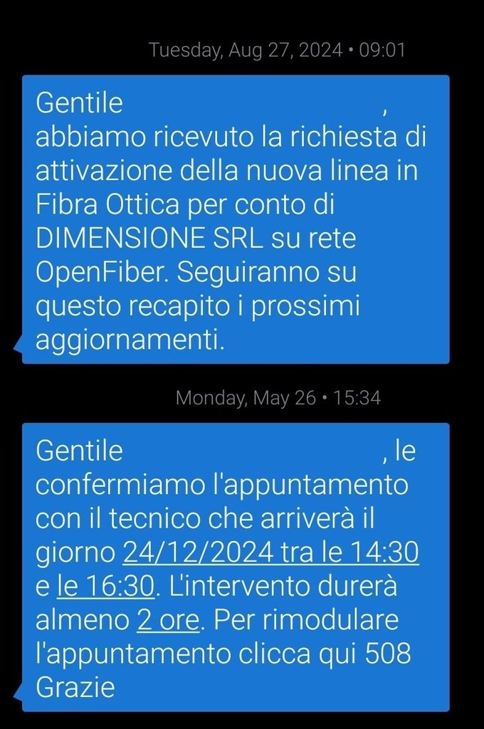 - 15/08/2024: Mi preoccupo e mando una mail per chiedere se i tecnici di Open Fiber si sono persi per i boschi; il 24/08 finalmente arriva il primo SMS da parte di Open Fiber che mi comunica di aver ricevuto la richiesta di attivazione