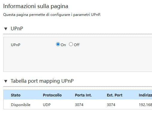Friiizz TheMarsican Ho controllato ed il UPnP è abilitato, ed addirittura nella sezione ''Tabella port mapping UPnP'' ho già la porta 3074 abilitata.