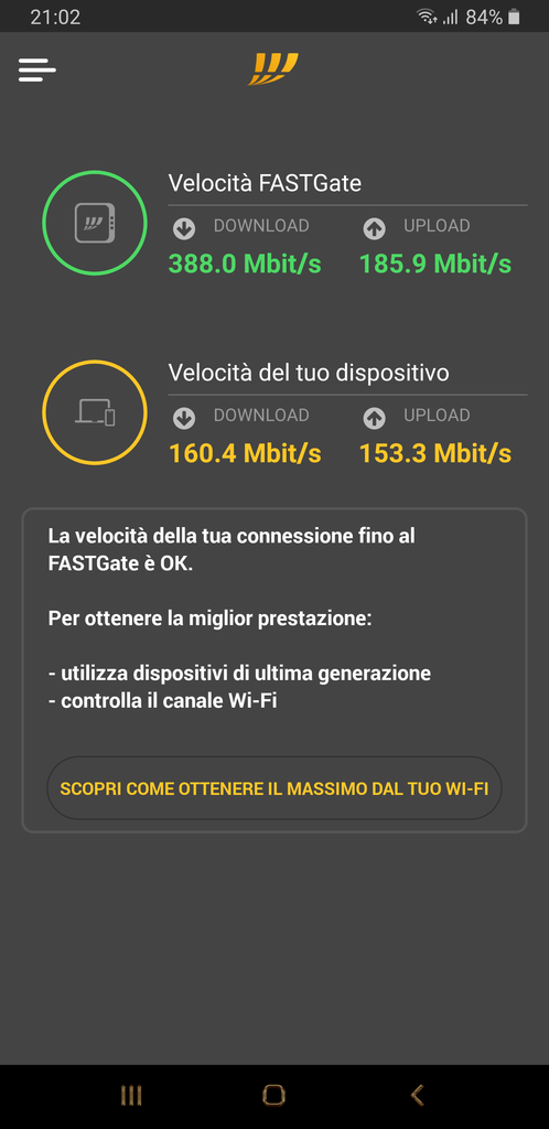 Allora... se faccio il test da casa mi da i risultati del pc ma non del router e siamo più o meno sui 300 /370 Mbit con cavo lan. Facendolo in remoto da cell alcune volte riesce a collegarsi al router (credo che l'app sia da migliorare...)