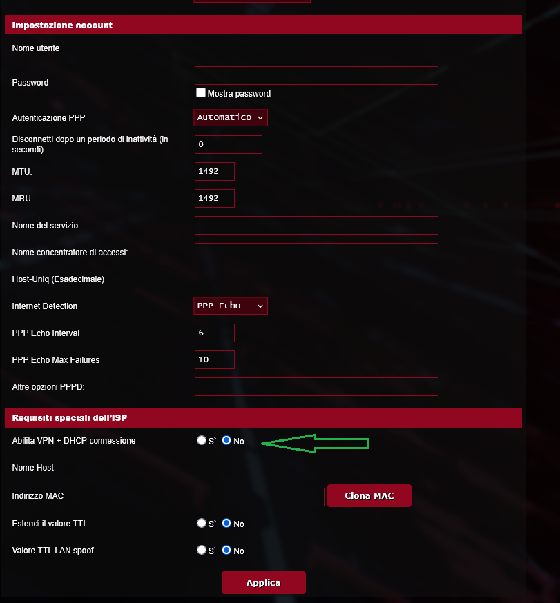 La connessione funziona bene solo se uso il router EOLO, oppure se metto l’Asus in cascata o come Access Point. Appena provo a collegare l’ONT direttamente all’Asus (in modalità router, con PPPoE, VLAN impostata ecc.), la rete sembra connessa ma non naviga correttamente: lo speed test ci mette tantissimo e alcune cose non funzionano.