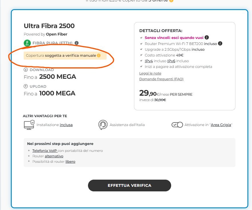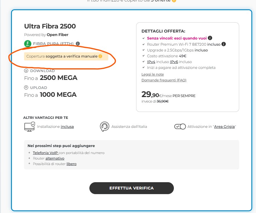 Ho verificato con vari operatori, tutti mostrano fttc tranne dimensione che indica ftth con verifica manuale, tuttavia dopo verifica tramite operatore telefonico mi confermano che non c'è ftth all'indirizzo richiesto (sono tutte case singole o bifamiliari nella via)