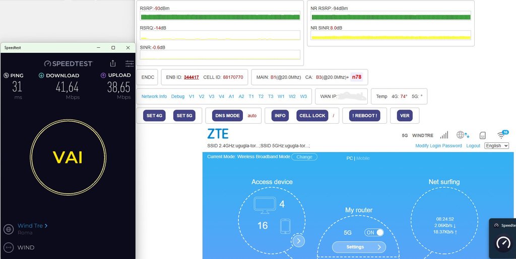 Dopo circa un'ora facendo speed test arrivo a 20 Mbps in download e circa 30 in upload. Se tramite hack clicco su 4g , auto e ok probabilmente riconnette la cella (stesse bande, non cambia niente) speedtest riprende come in precedenza. Stessa cosa se riavvio.