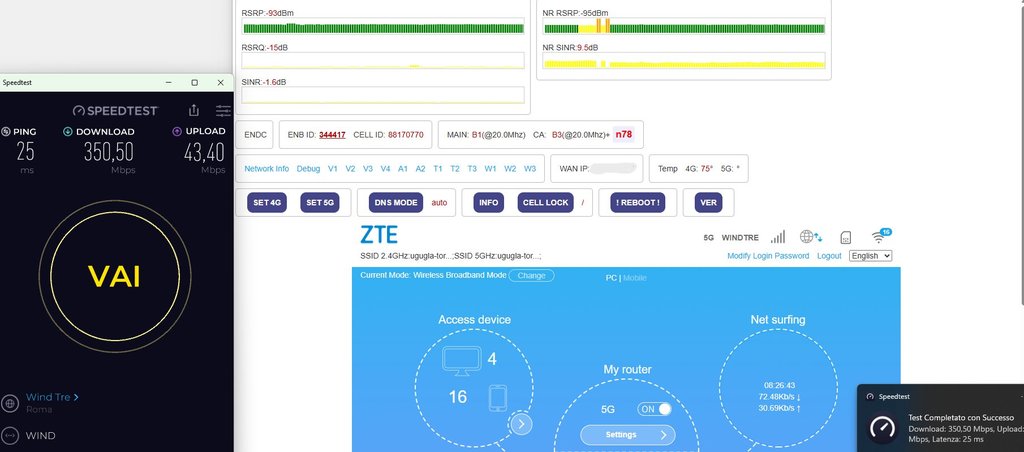 Praticamente riavvio il router ogni giorno alel 7 di mattina (ma succede anche se non riavvio), quindi si collega alla solita cella. Normalmente la mia connessione aggrega B1+B3+N78 in automatico e mi garantisce fra i 300 e i 400 Mbps in download e circa 50-70 in upload.