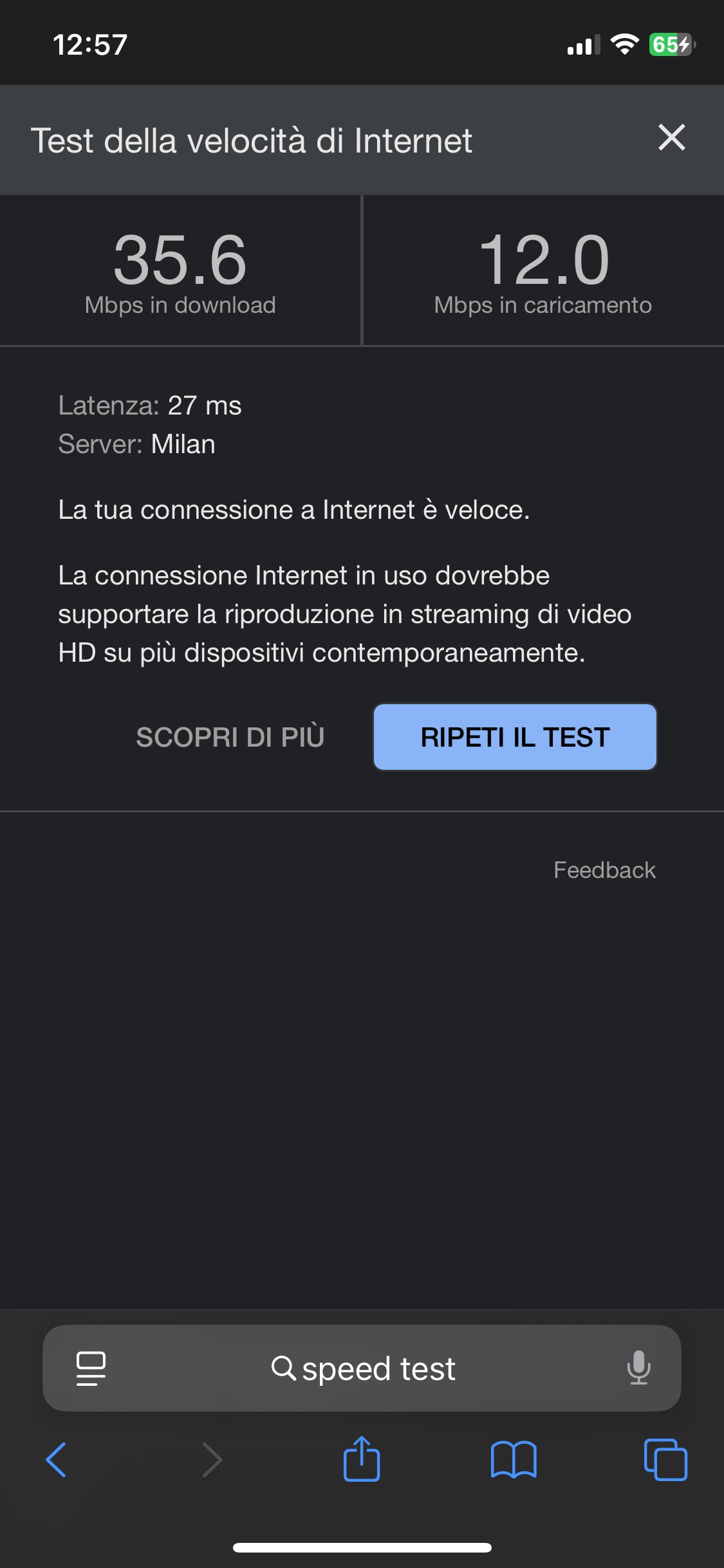 Buonasera, mi scuso se ho aperto più di un thread ma oggi è il mio primo giorno di ftth da 2.5 gigabit con dimensione, vari test effettuati oggi tutto normale oscilla tra i 600 e gli 800 megabit in download con wifi su cellulari e su pc tra i 200 e i 400 megabit. La cosa molto strana è che stasera da circa 1 oretta si è verificato questo calo molto significativo della connessione, allego speedtest effettuato in qualche minuto fa, qualcuno sa come mai?