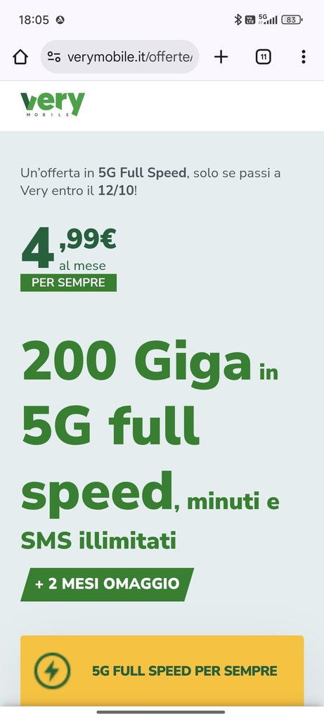 Jimbo lollapalooza Tornata… https://verymobile.it/offerte/winback/very-winback-499f Qualcuno ha un coupon in più per questa offerta? Ben disposto ad usare il vostro codice amico in caso, mail in bio. Grazie mille. P.S.: ho già provato un paio di volte ad attivare la winback very ed entrambe le volte mi hanno rimborsato i soldi per "mancata consegna" della SIM. Qualcun altro ha avuto lo stesso problema? Come si risolve?