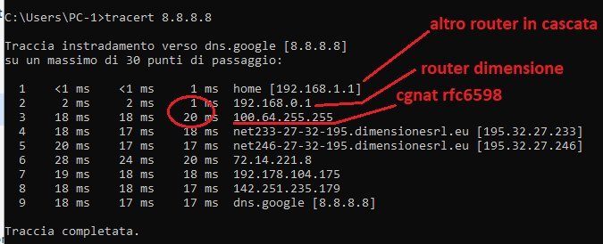 Salve a tutti , da poco utente Dimensione sotto Fibercop e che dire , soddisfatto della velocità DL e UL con profilo a 2.5gbps (2200mbps Dl e 1010 Ul praticamente costante 24/7) ....purtroppo però , ho potuto notare sin da subito un problema di ping alto e jitter , piuttosto bizzaro data ormai la tecnologia FTTH sempre più diffusa sul territorio (forse è proprio quello il problema??) che come da titolo , sono abbastanza sicuro da associare al CGNAT sull'instradamento. Ciò che è anzora più bizzarro è che proprio stamani mi è stato fornito IP Pubblico statico a pagamento e nonostante questo , risulto ancora sotto CGNAT con lo stesso IP double nattato che ho sin dall'attivazione. Mi chiedo come sia possibile dato che dovrebbe essere un mio IP dedicato (in teoria). Dall'assistenza , sempre gentilissima e disponibile , pare non ci sia modo di bypassare il problema ma non capisco come mai alcuni ISP , da quel che ho potuto leggere in giro , non ne hanno bisogno. Esiste un modo per disattivare , bypassare "trollare" il CGNAT ? Allego dei traceroute per aiutarmi a capire meglio se è tutto normale o è veramente un nodo debole dell'instradamento o se comunque è risolvibile in qualche modo. La gentile operatrice mi ha consigliato di mandare una mail all'assistenza e attendo risposta. PS : Non sono un ferratissimo della materia , non me ne vogliate se mi sono espresso in modo molto ABC 🙂 .....se servono altre info posso fornire tutto il necessario.