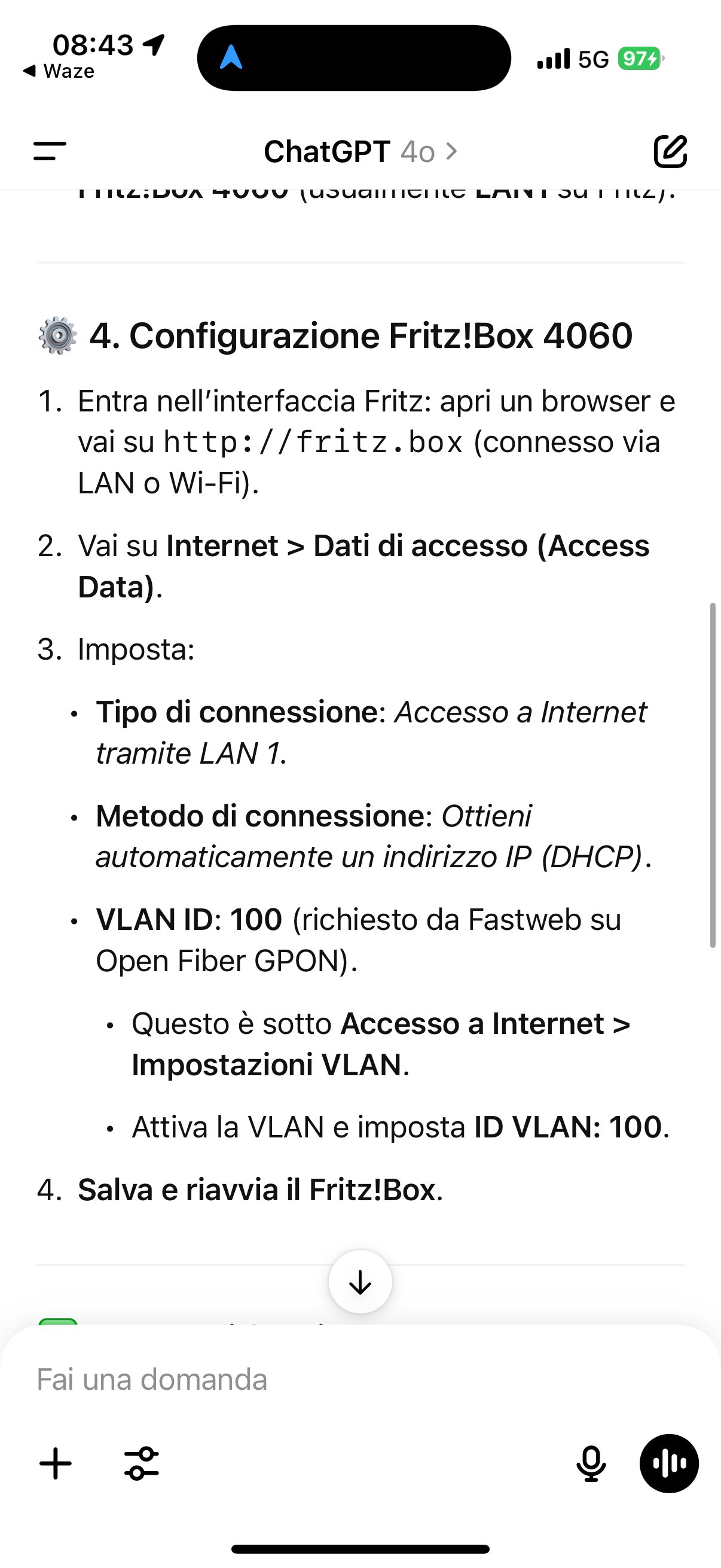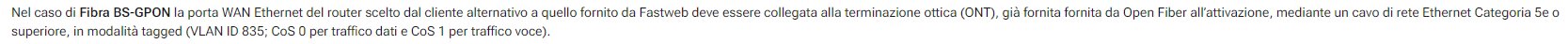 TheMarsican williambrown La parte di configurazione del Fritz devi comunque farla ma solo dopo che Fastweb avrà abilitato il MAC Addres del router. FW autentica la connessione tramite il MAC Address del router. Comunque è anche errata: devi sì mettere il Fritz in DHCP (Fritz chiede se sono necessarie le credenziali o no, tu devi dirgli di no) ma la VLAN su OF è la 835. Come indicato sul sito FW: https://www.fastweb.it/adsl-fibra-ottica/dettagli/altri-modem/