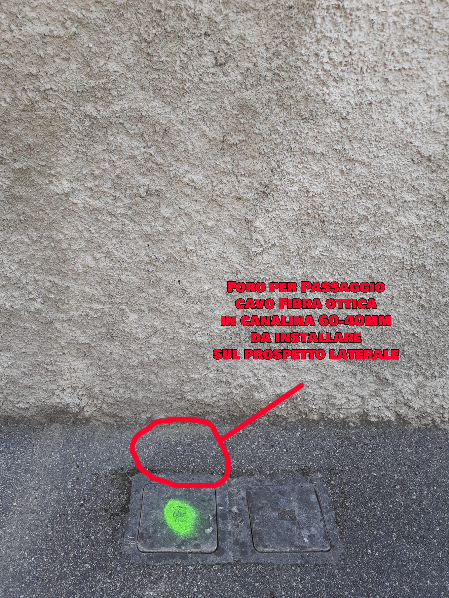 Propone allora di installare in facciata il ROE ma dice che il foto che va dal pozzetto condominiale, che allego in foto, alla facciata, con uscita di un tubo in cui passerà la loro fibra, è a carico del condominio.