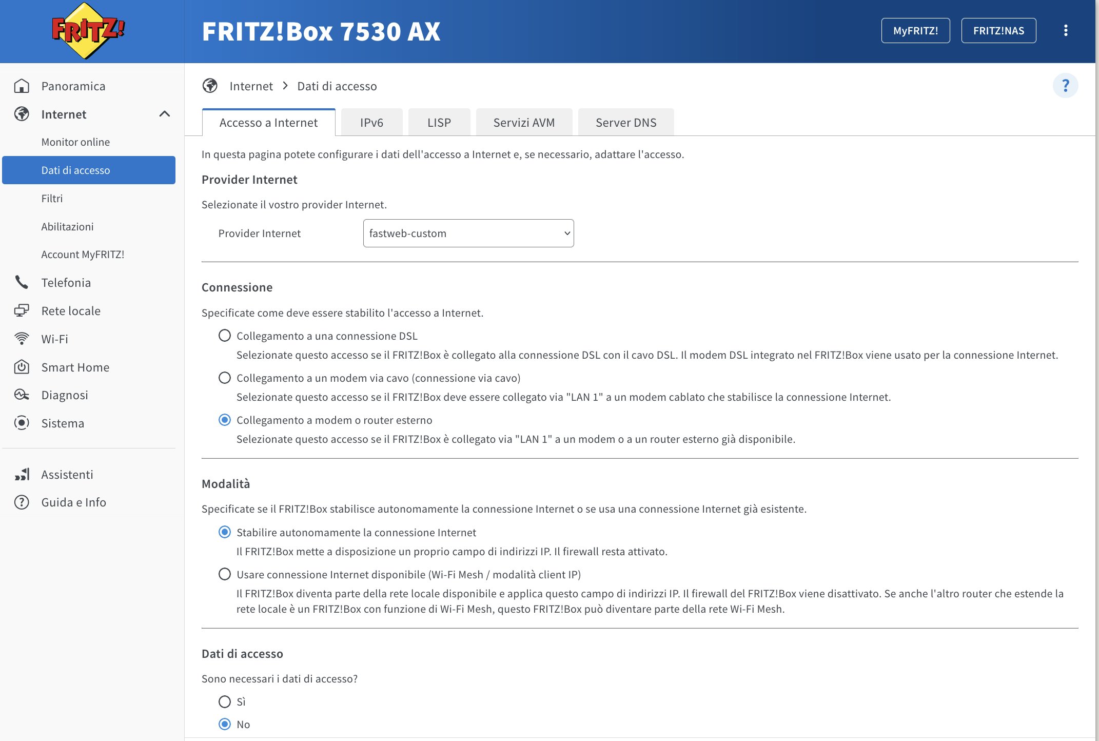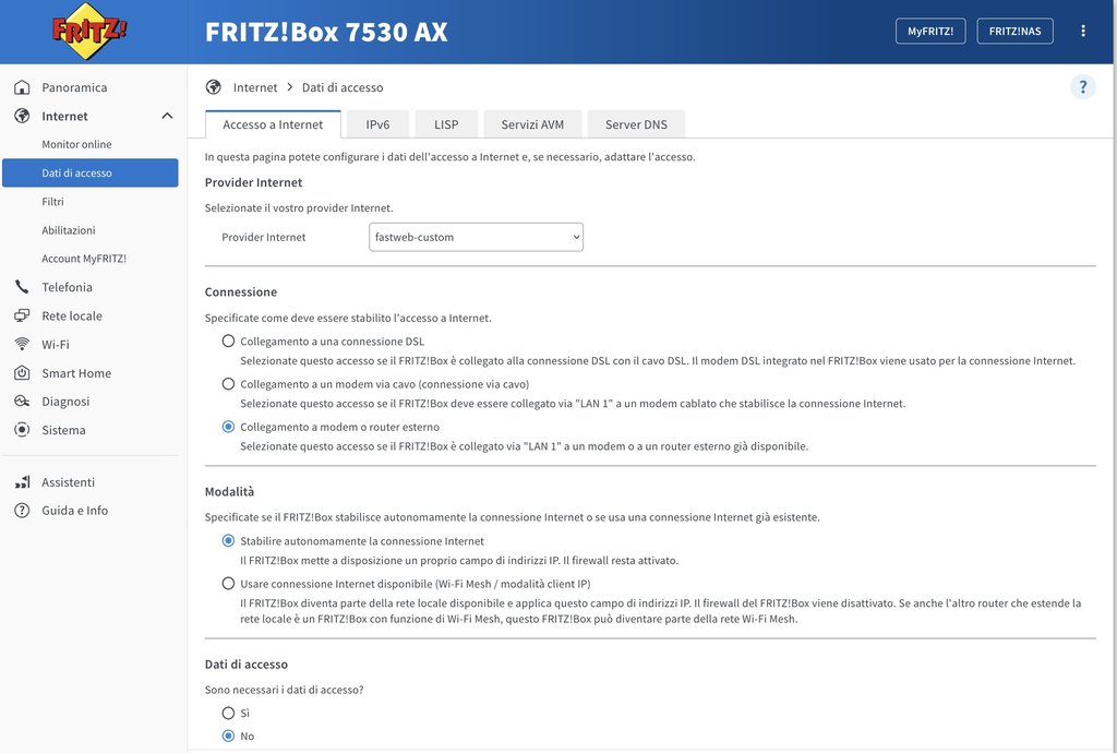 Buongiorno a tutti, vi scrivo perche è da piu di una settimana che ho attivato il passaggio da FTTC a FTTH con fastweb (su open fiber) e, dopo che mi è stata attivata la fibra (aggiungendomi anche un ONT openfiber della ZTE a casa), ho il problema che col mio modem personale Fritzbox 7530 AX non riesco piu ad accedere a Internet. Purtroppo per evitare di rimanere senza connessione, ho dovuto ricollegare il vecchio fastgate che risulta quindi l'unico apparecchio che mi permette di navigare.
