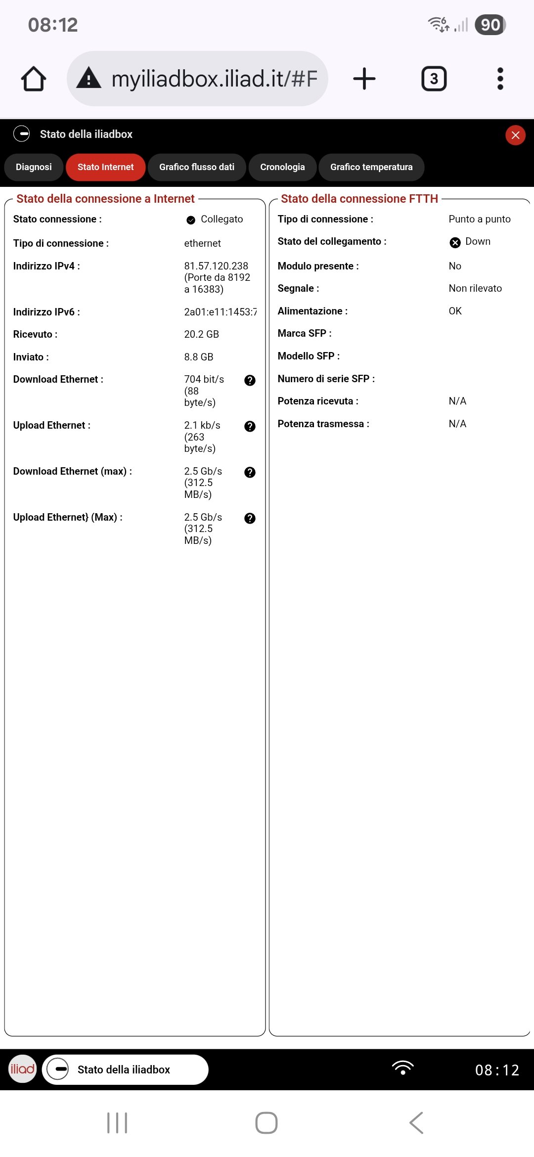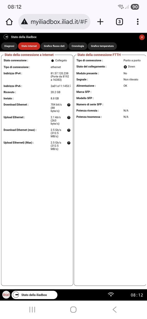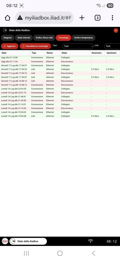 Bast EvaVsEva Se la tua linea non è su infrastruttura proprietaria Iliad (solo le linee fino a 5 Gb/s lo sono) la Iliadbox non può mostrare la potenza del segnale. Nel tuo caso quindi non puoi vedere ciò tramite Iliadbox, e forse nemmeno collegandoti direttamente tramite PC all'ONT. La cosa più semplice che puoi fare è contattare l'assistenza Iliad e far presente il problema delle disconnessioni