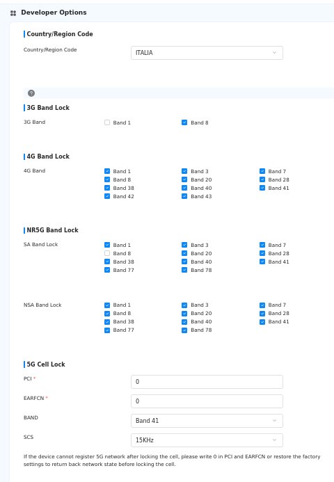 Salve, il router in questione arriva già con la funzione developer, tramite interfaccia per effettuare il cell lock, ho visto che ho a poca distanza una BTS Wind3 e LTE Italy riporta copertura mista 4G/5G con Bande B7 B1 B3 B20, celle 0, 1, 2, 6, 7, 8, 12, 13, 14, 18, 19, 20 e la banda N3 TDD sub-6GHz Inter-site, FDD Passive, DSS.