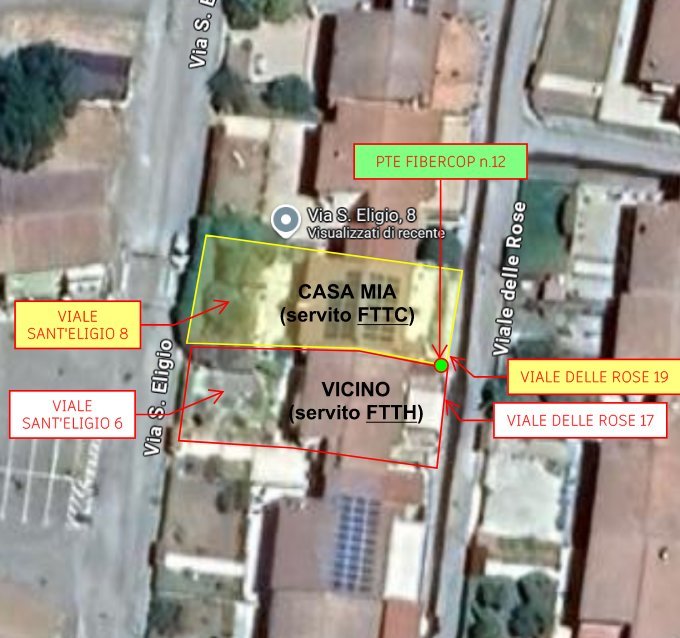 Entrambe le strade su cui si affaccia casa mia sono servite da FTTH fino e non oltre la casa del mio vicino al all'indirizzo VIALE SANT'ELIGIO 6 / VIALE DELLE ROSE 17.