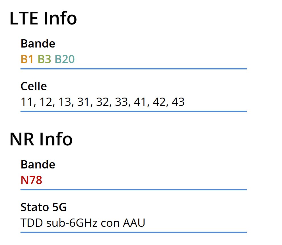 Buongiorno a tutti, al momento ho un router 5G (tenda) con una SIM Iliad e performance abbastanza penose e soprattutto degradate negli ultimi mesi (adesso parliamo di uno speed test da 16mb in down, 24 in up e ping di 50ms). Queste le info della BTS Iliad vicina a casa mia: