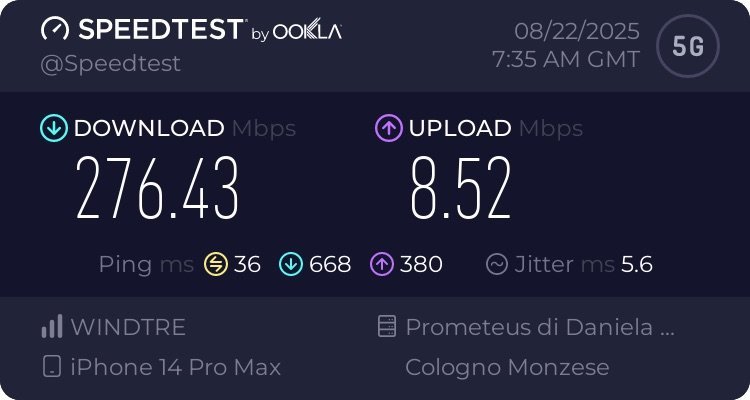 Allora, i miracoli esistono, sempre che non ci sia una spiegazione migliore. Oggi il test 5G mi ha dato 276mbps in download, rispetto ai 75mbps della settimana scorsa. Non penso che congestione o meteo possano fare una differenza del genere? Purtroppo ping e upload fanno un po' schifo comunque.
