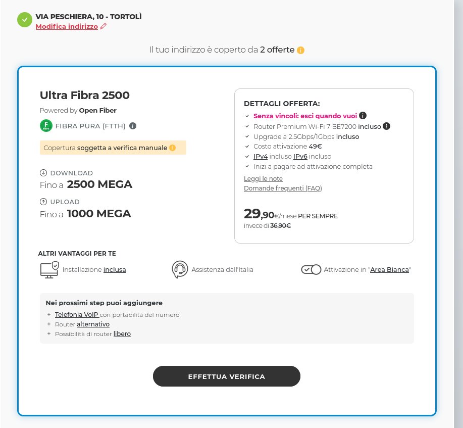 Luca093 Buongiorno, l’anno scorso, effettuando la verifica al mio indirizzo, risultavo coperto solo da FWA e da FTTC. Avendo provato ad attivare la seconda, con scarsi risultati a causa dell’esito negativo per la posa del cavo fino a casa, avevo lasciato perdere. Ora, però, andando sul sito Dimensione mi risulta copertura in FTTH, ma con “verifica manuale”. Potrebbe trattarsi di un errore?