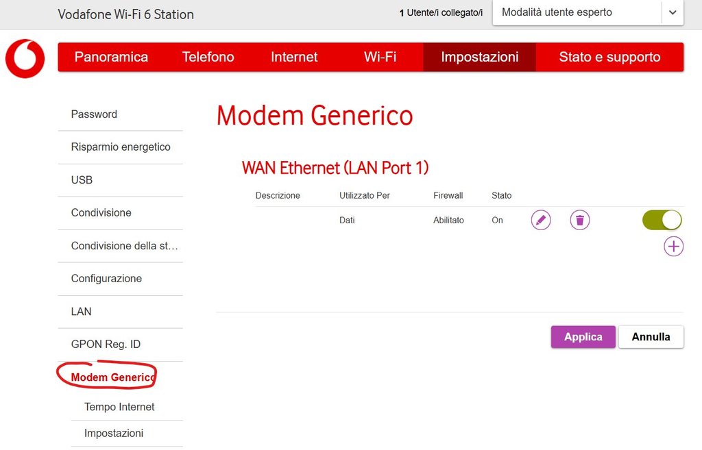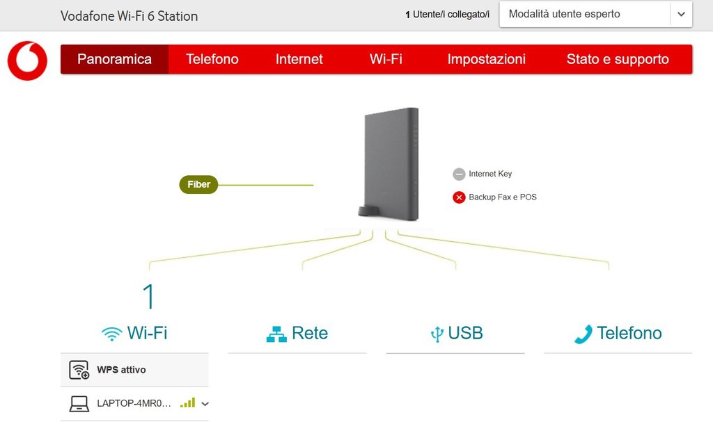 Sono entrato dentro la pagina vodafone.station, accesso con i dati presenti sul lato del router originale e ho impostato la modalità a "utente esperto" sulla tendina in alto a destra.