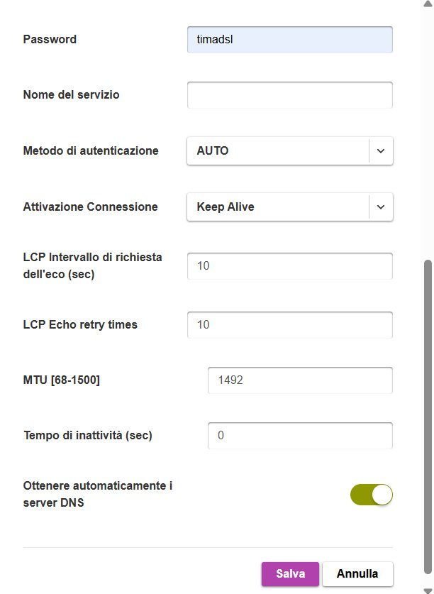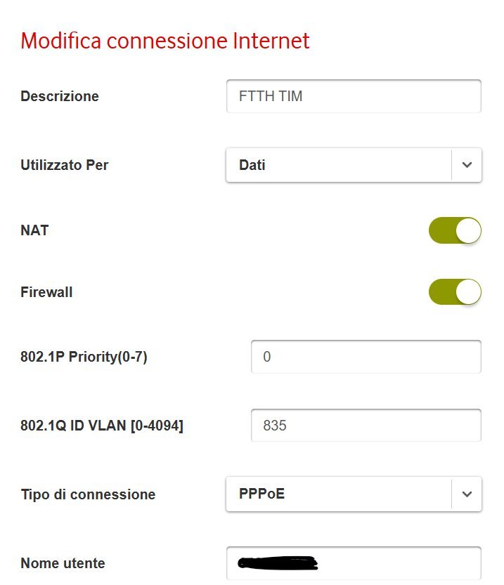 Qui sopra i dati che ho inserito nei vari campi (VLAN 835 per l'appunto, il numero di telefono fisso mio su nome utente e timadsl come password da come ho visto anche su questo sito) , lasciando altri impostati di default.