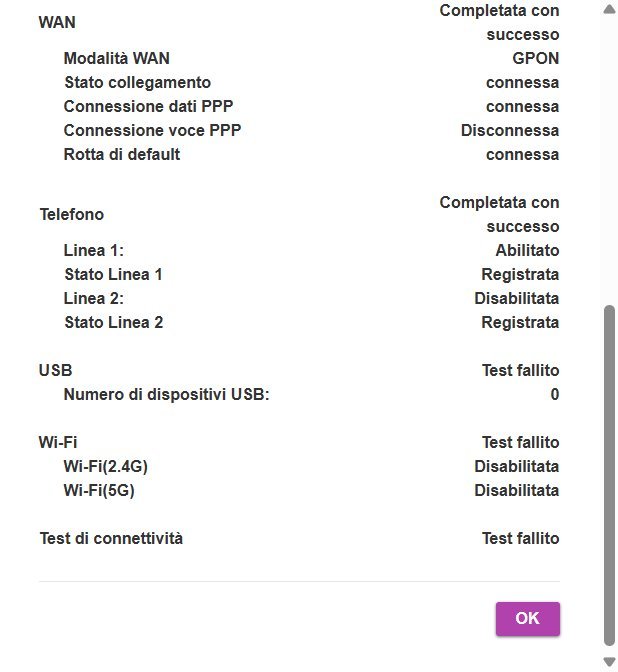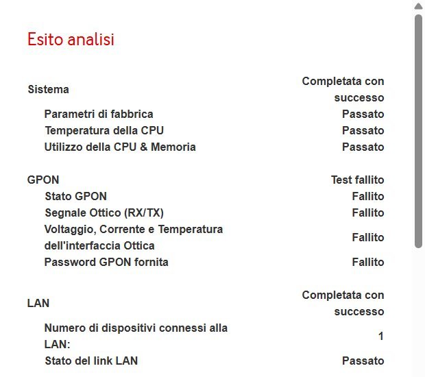 Ho salvato, atteso un minuto, riavviato ONT, riavviato il router VPS6, la spia su internet è bianca come dovrebbe essere, ma internet non "arriva". Ho fatto la diagnosi sempre sul portale vodafone.station e questo è quello che esce: