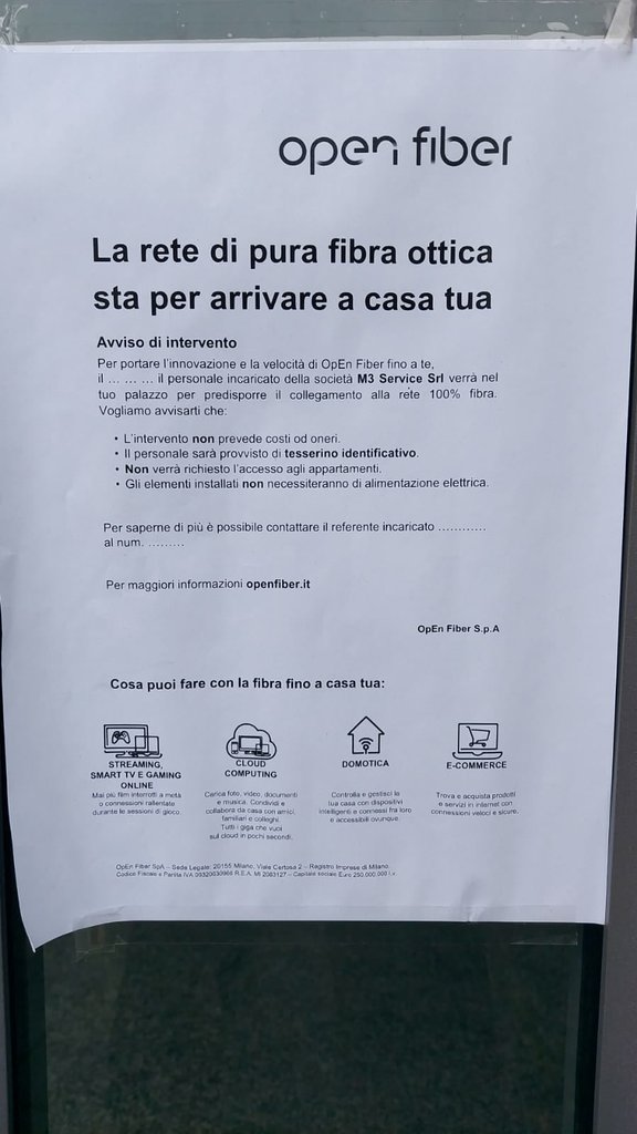 Arix Buongiorno a tutti. In via castellana OPENFIBER ha appeso i volantini sulle porte dei condomini. Nel frattempo, in via conte di Cavour vicino all armadio fttc che serve la mia abitazione, hanno posato un armadio marchiato TIM, che però sembra molto diverso da quelli visti in giro (è più basso e non ha il coperchio rosso). Mi chiedo il perché.