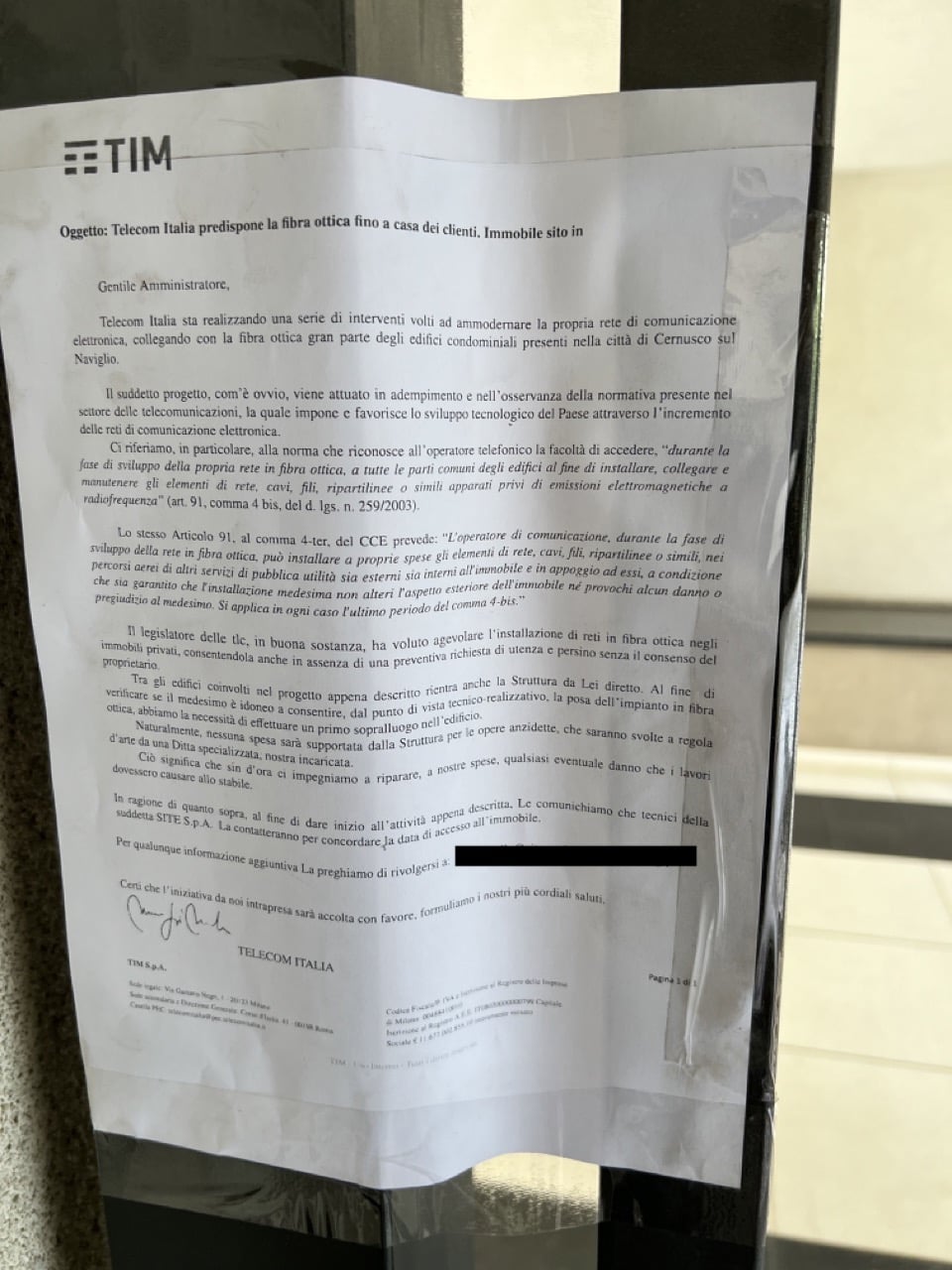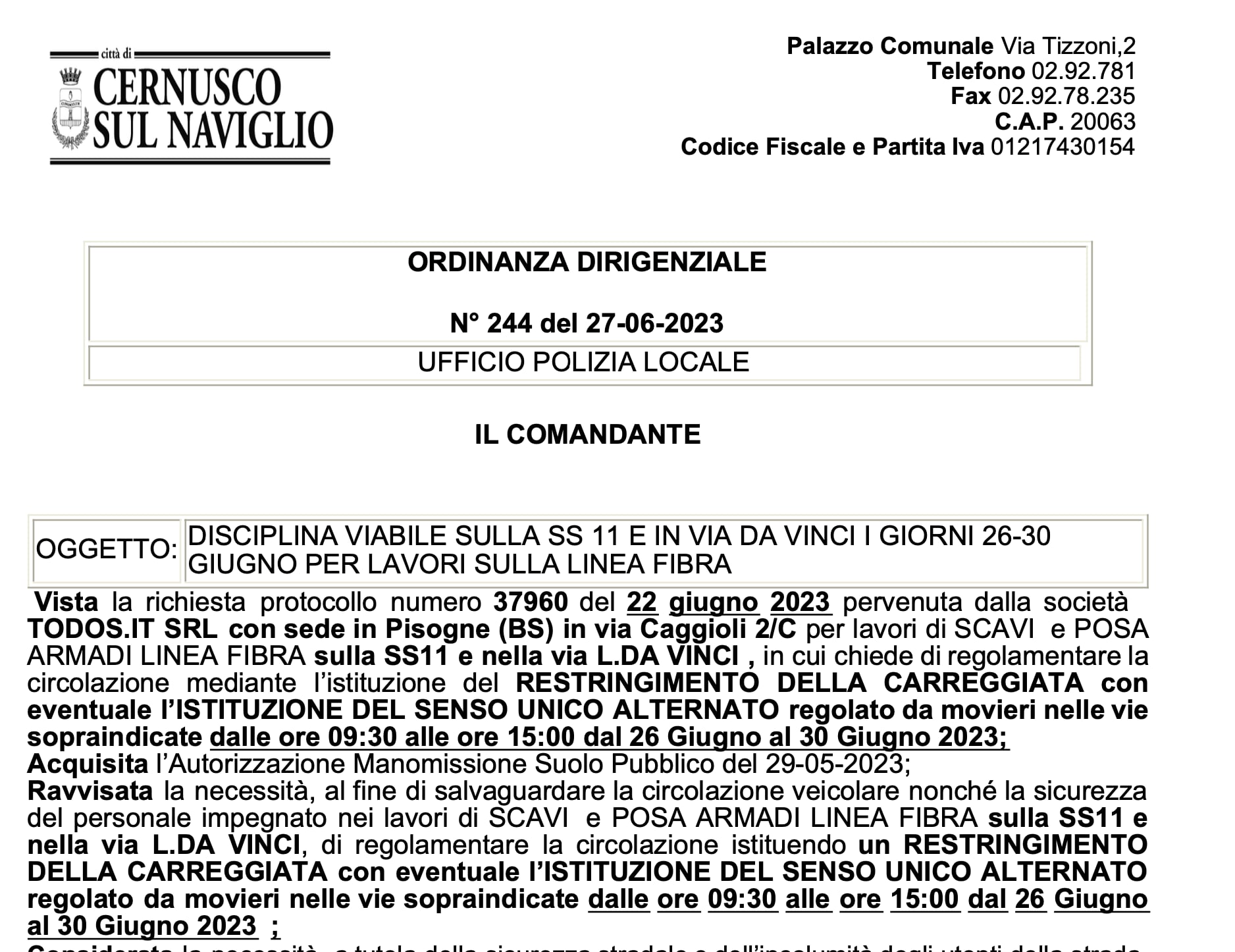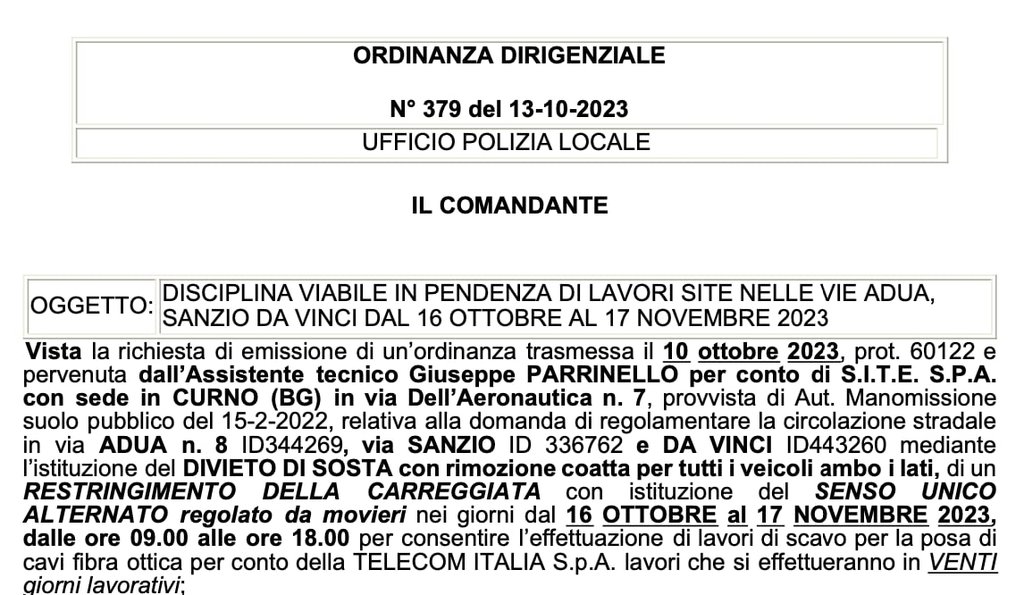 - FiberCop Ordinanza per SITE/Fibercop su Via Adua, Sanzio e Leonardo da Vinci. La cosa positiva è che stanno sistemando una situazione in rete rigida (via San Francesco) con l'installazione di un nuovo armadio in Leonardo da Vinci che è una operazione più costosa rispetto ad un normale allacciamento.