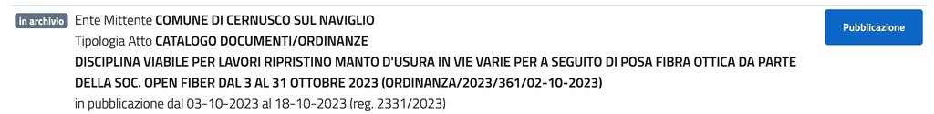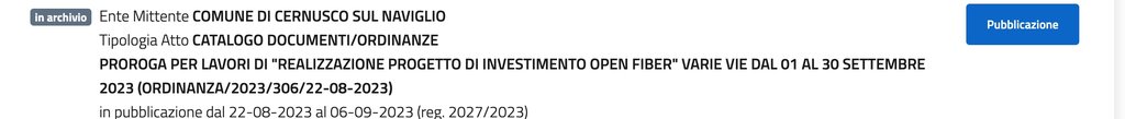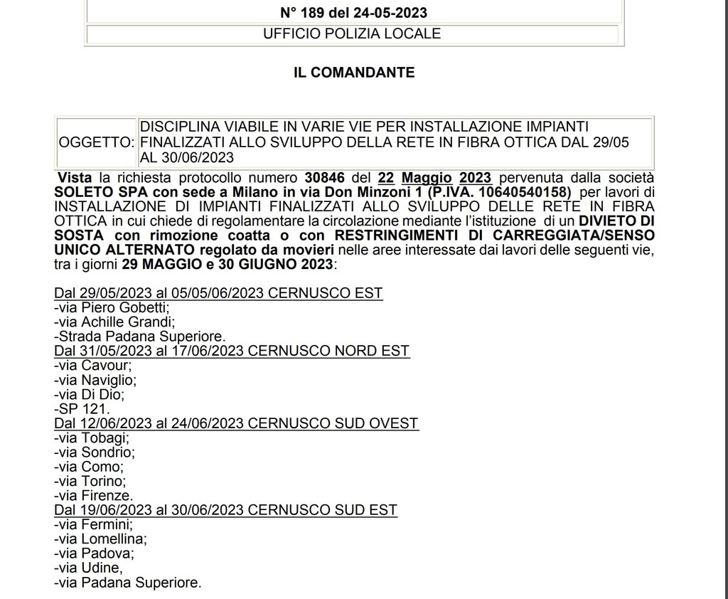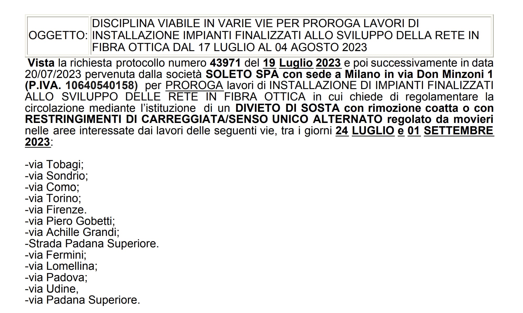 Fanda A correzione del mio post precedente. Nuova proroga di ordinanza per Soleto/OpenFiber per le stesse vie richieste il 24/05/2023. Quindi stanno ancora lavorando sulla parte a Sud della padana