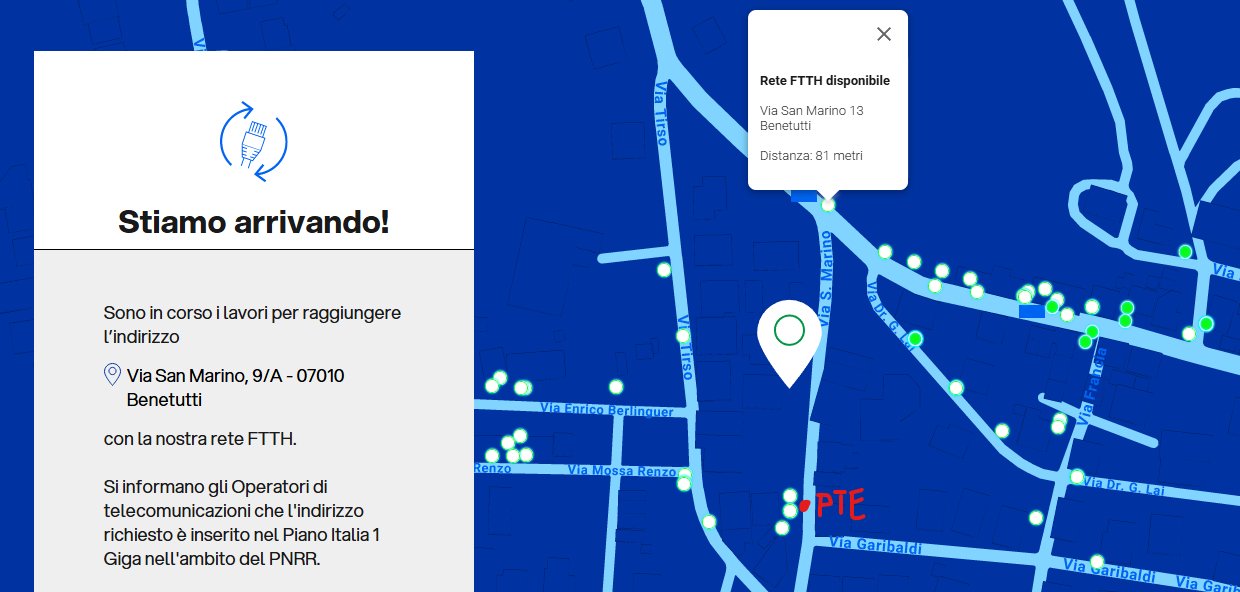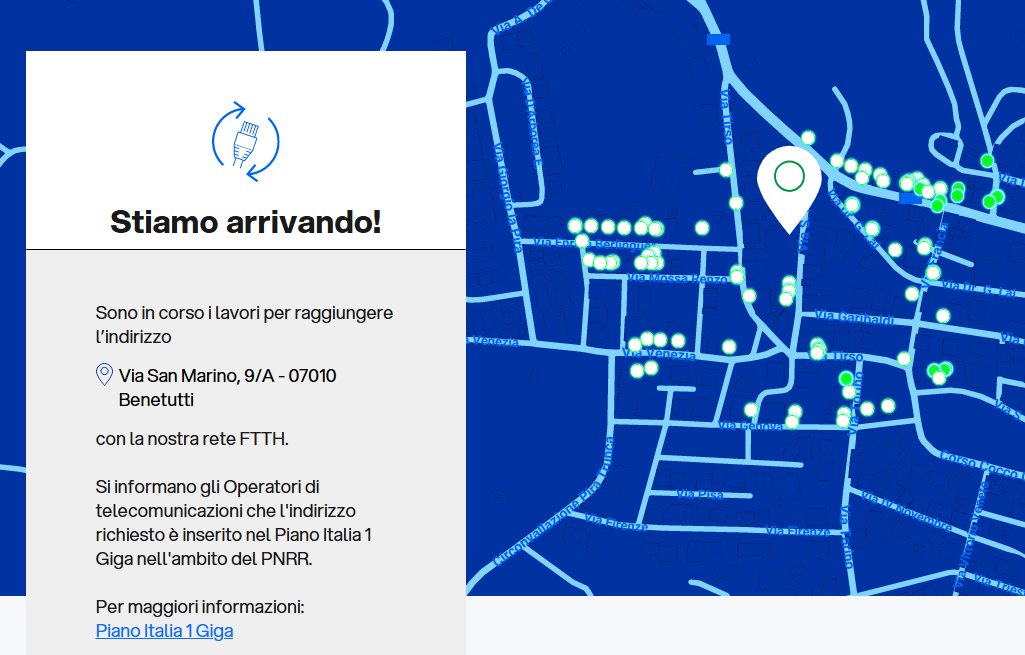 Con mia sorpresa, ho notato che alcuni civici relativi a questo armadio risultano già vendibili (ho verificato personalmente la copertura con una delle offerte fibra di TIM) mentre il mio e tantissimi altri non lo sono.