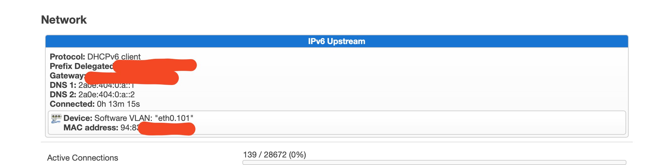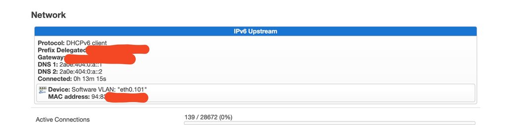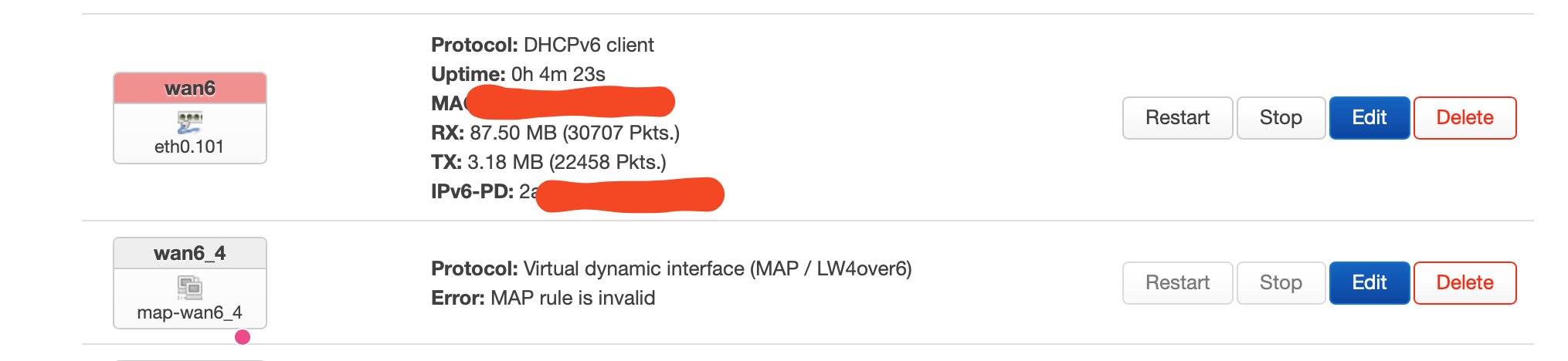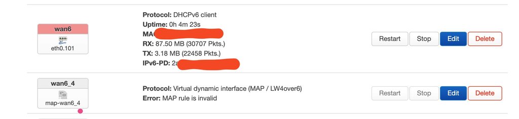 zichichi Ciao a tutti, ho seguito le varie indicazioni sul forum per configurare sky sul mio router flint 3. Il router riceve ipv6 da sky, riesco a navigare su siti con ipv6 attivo, ma non vado oltre. Il problema è nell'interfaccia map-wan6_4 che viene creata durante la configurazione, è come se non ricevesse i giusti parametri da sky e quindi non fa da "bridge" con ipv4.