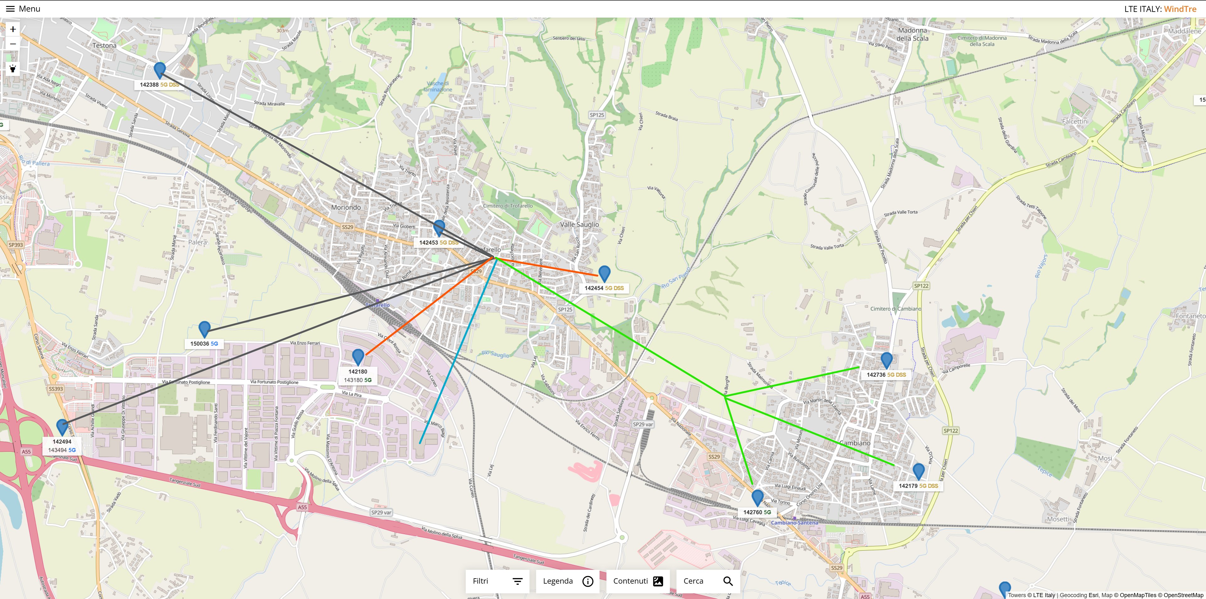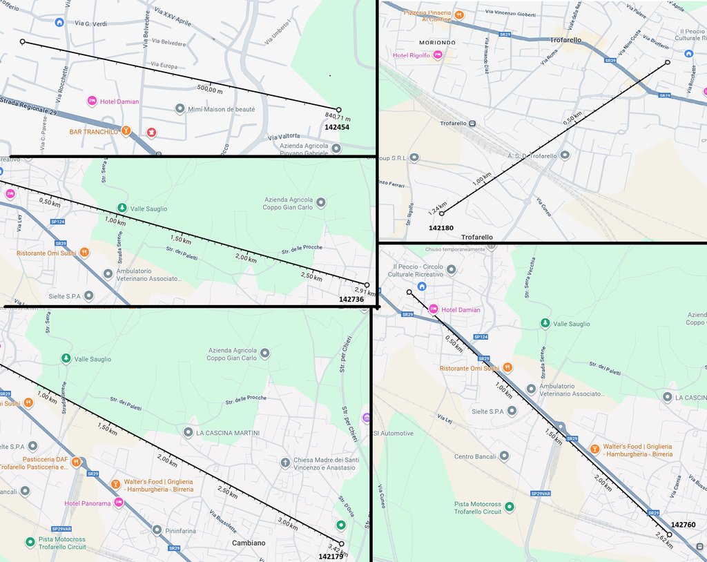 LINEA AZZURRA : punto di riferimento Fiorentini Alimentari (Via Marco Biagi, 8, 10028 Trofarello TO) che vedo chiaramente guardando dritto al terrazzo.
