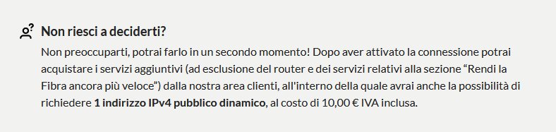 IP pubblico IPv4: Ho capito che Aruba fornisce di default IP nattato con possibilità di IPv6 pubblico. Nell'offerta è documentata solo l'opzione per IP statico pubblico (IPv4), ma a me interesserebbe l'IP pubblico dinamico (IPv4). Il call center mi ha confermato che è disponibile con pagamento una tantum di circa 10/20 euro dopo attivazione, però questa opzione non è menzionata da nessuna parte nei documenti ufficiali. Qualcuno ha esperienza diretta?