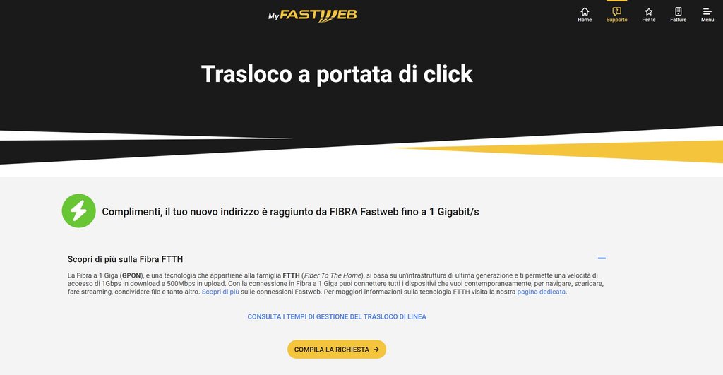 Oggi invece mi sono accorto che, smanettando nell'area MyFastweb, posso richiedere un trasloco della linea, e me lo dà possibile per quell'indirizzo che risulta coperto da FTTH (che, sostanzialmente, è lo stesso indirizzo dove sono ora ma con il nome del condominio).