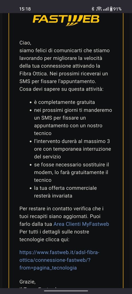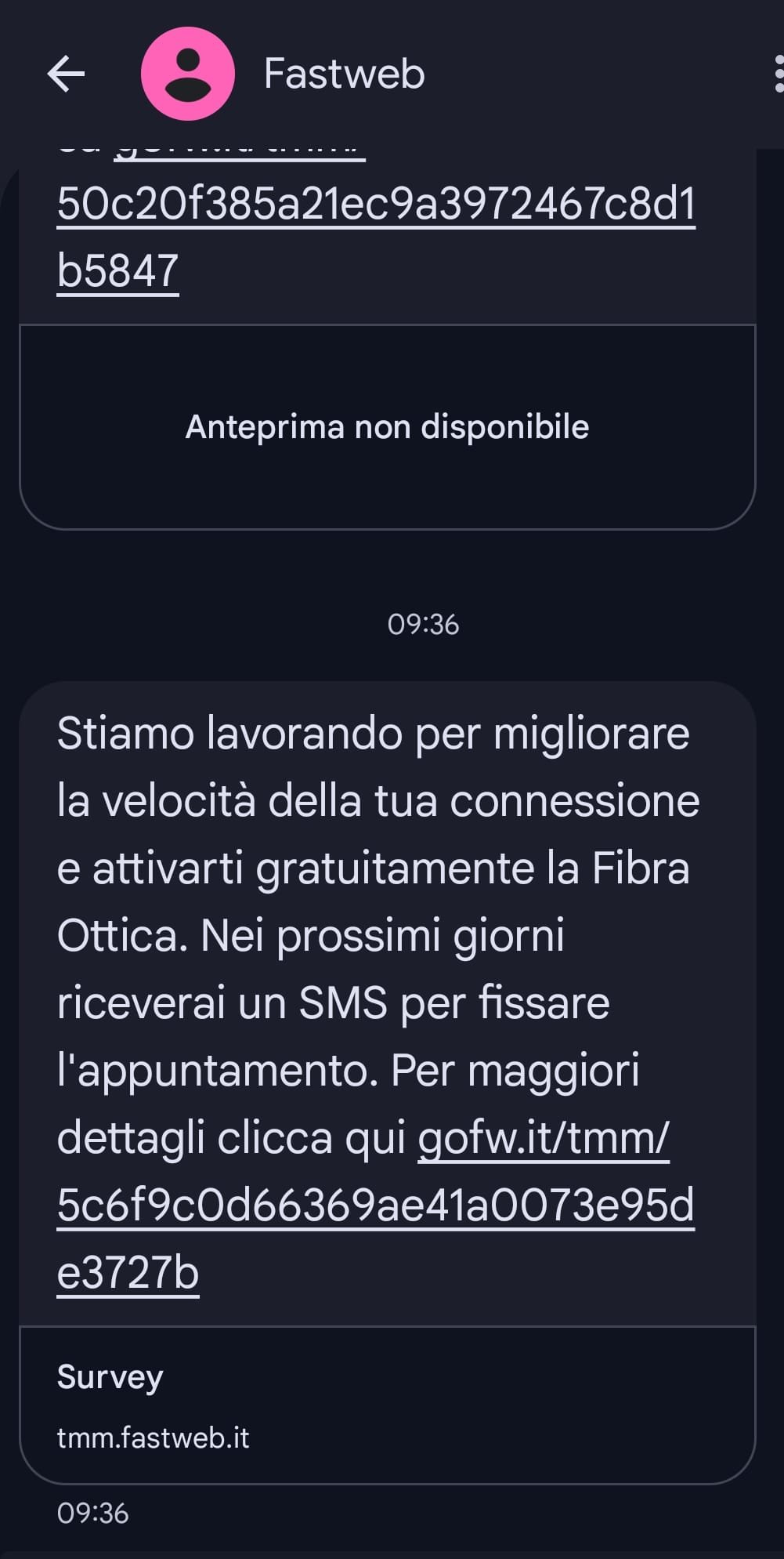 Ho ricevuto un messaggio (sospetto?) che fa riferimento alla copertura in fibra. Non sono cliente fastweb fisso (attuale WindTre), ho solo mobile, aprendo il link riporta solo a un riassunto di come si procederanno senza richiedere dati sensibili. Intendiamoci, ho fatto in passato un contratto fastweb ma non ho potuto completarlo e attualmente ho una FTTC Fastweb Business, che però è collegato a un numero di telefono diverso dal mio personale e, lì in zona è già disponibile FTTH da un pò di tempo. Quindi è... attendibile?