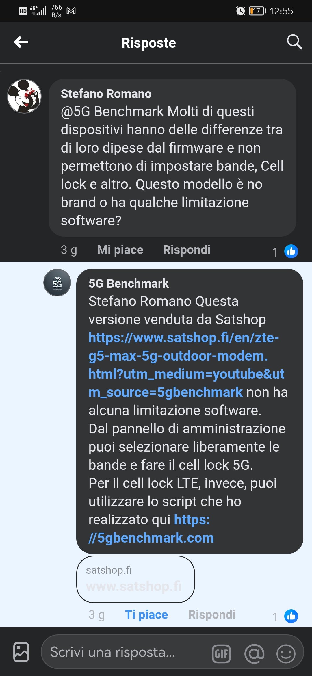 Stefan1578 Il link è questo 👇🏼 https://www.satshop.fi/en/zte-g5-max-5g-outdoor-modem.html?utm_medium=youtube&utm_source=5gbenchmark&fbclid=IwY2xjawNll9xleHRuA2FlbQIxMQABHnNmiVx3bPNfbHxxQsX3pzO1JfDeP1DLKD2FzVKTDPGDH-4PI5Aohzb_4GN2_aem_O4QQAO14efsMXWfJB2B79w Ha pure messo il link ad uno script realizzato da lui👇🏼 https://5gbenchmark.com/?fbclid=IwY2xjawNlmFpleHRuA2FlbQIxMQABHqulD9EN1TVDB12Yi6DrDdSMhsYBGHyl8iFlgSLHio9PQJA-Q4pkumjpiPx1_aem_6qdE2nV0ofdD8SKM0D99Pg