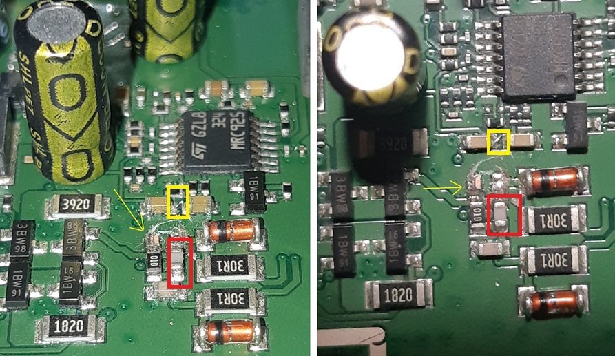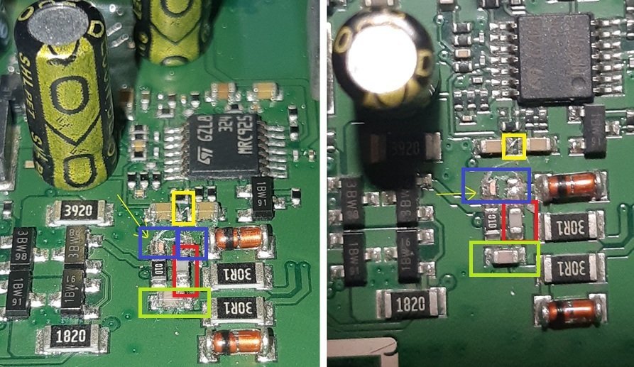 Misura la tensione nei reofori ( sono i punti di saldatura dove hai levato il condensatore ) del area blu in foto e quella verde , se nell area blu ci sono circa 34volt vuol dire che il problema è nel fusibile del punto 2 e nella resistenza da 10 ohm affianco ( quella dove ce scritto 010 ) altrimenti se dove ce l area blu non ce comunque tensione vuol dire che il problema è piu a monte , prova a misurare anche i due condensatori dove ce il riquadro giallo