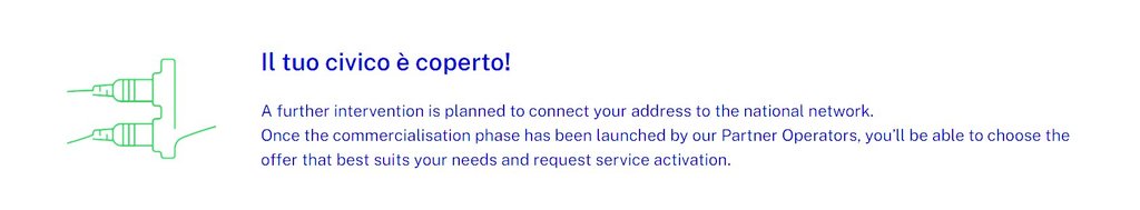 Il mio civico risulta finalmente coperto sia secondo quanto mi hanno confermato gli operai durante i lavori, sia sul sito di Open Fiber. Tuttavia, la connessione non è ancora commercializzabile.