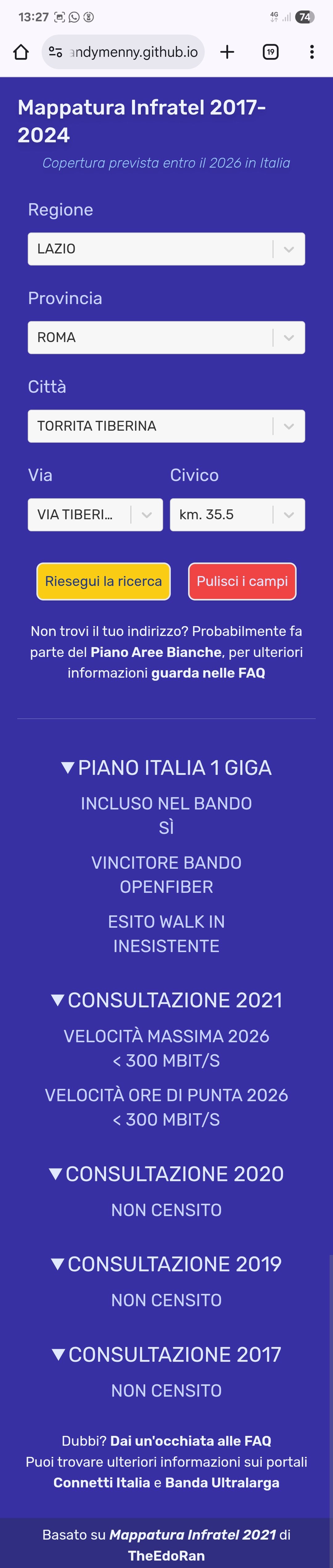 abito in Via Tiberina Km 35.5, Torrita Tiberina. E' un comprensorio (con strada pubblica) che rientra tra le aree grige/nere che ricadono nel Piano Italia 1 Giga, perché ancora non c'è FTTH o FWA con infrastruttura dedicata (solo quella condivisa, tipo FWA 5G di Vodafone, Windtre e TIM, oppure Eolo 30 Mega), infatti come unica opzione di rete cablata c'è l'ADSL.