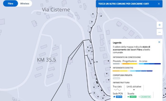 Il problema è che, secondo il portale BUL, nel mio comune i lavori risultano finiti già nel 2021 (posso confermare che da anni non vedo cantieri), infatti sono stati coperti la maggior parte dei civici, tranne alcuni (oltre quelli del Km 35.5 anche via Cisterne, che rientra nello stesso piano). Sostanzialmente hanno "dimenticato" l'ultimo miglio, perché manca il prolungamento della dorsale.