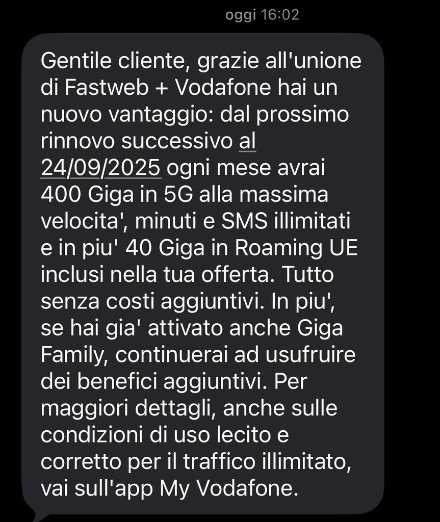 Tunrake FabioDarconte Su mobile ho Vodafone Silver 12,99 al mese con giga, sms e minuti illimitati in 5G, su Fisso pago 21,90 con fibra a 2,5gbps e in più ho un'altra sim della Giga Family con 80gb. Adesso con questa ulteriore offerta avrò anche 40gb di roaming in ue
