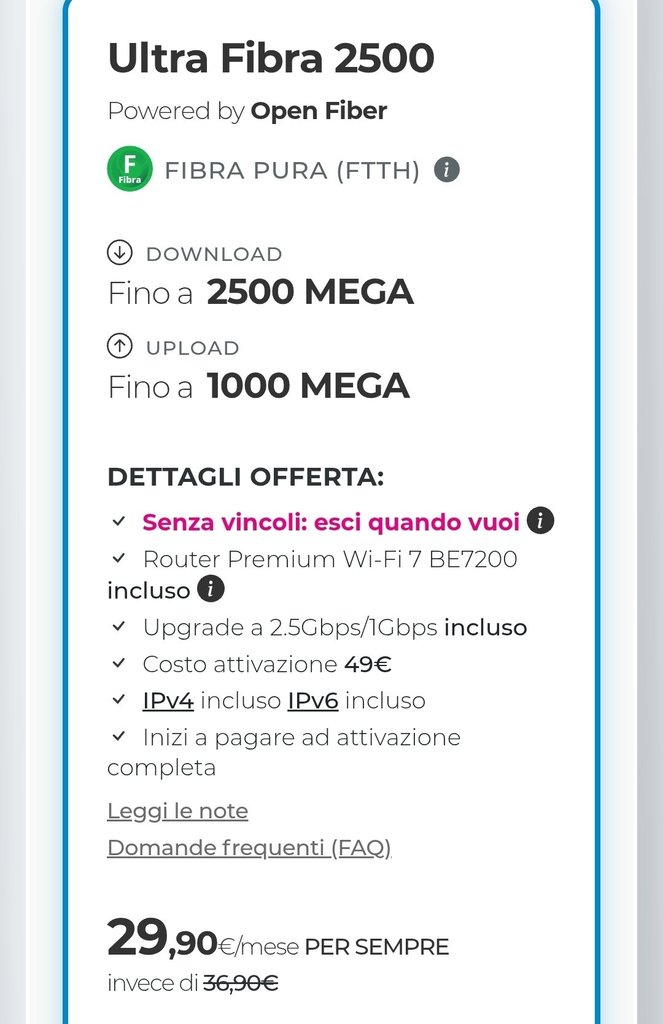 Luchella mitch_el Si, in effetti in molti mi hanno sconsigliato Tim su OF. Mi hanno detto che Tim "rende" meglio su fibercop. Ho adocchiato Dimensione da giorni ma non ho ancora deciso al 100%. Sicuramente mi levo da Tim e dalla pessima FTTC causa distanza. Il mio amico con Wind è soddisfatto tranne per il ping abbastanza elevato.