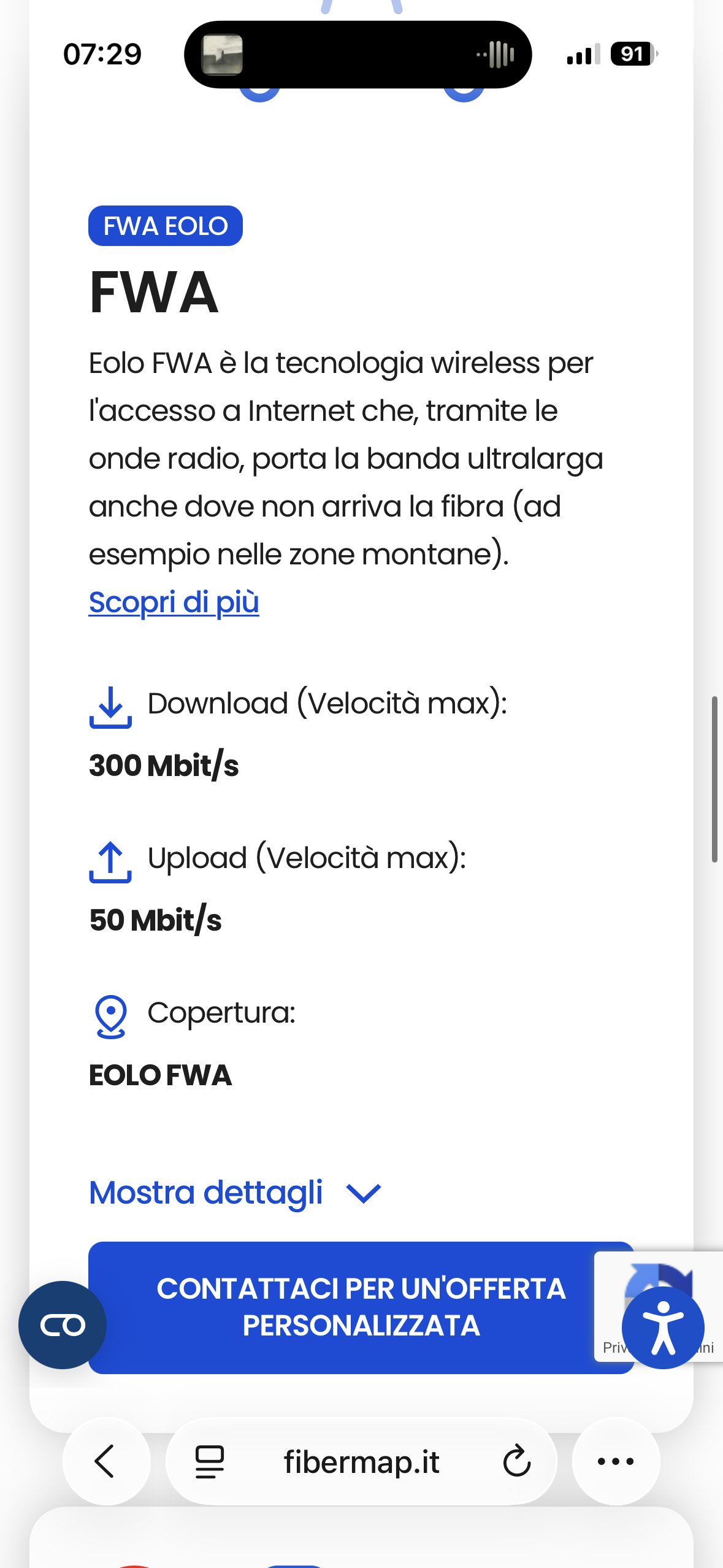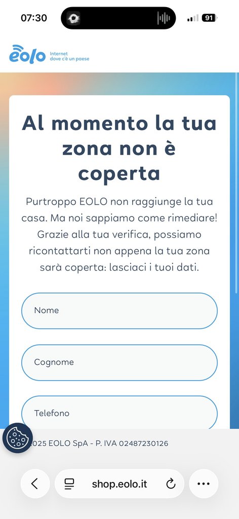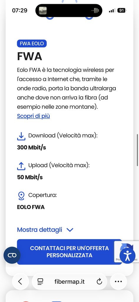 Niccolo05 Buongiorno a tutti, ieri ho controllato su Fibermap e ho visto che nella mia via risulta disponibile la connessione Eolo da 300 Mb, ma sul sito ufficiale di Eolo mi appare “copertura non disponibile”. Vi chiedo: Fibermap è affidabile oppure potrebbe esserci un errore? (