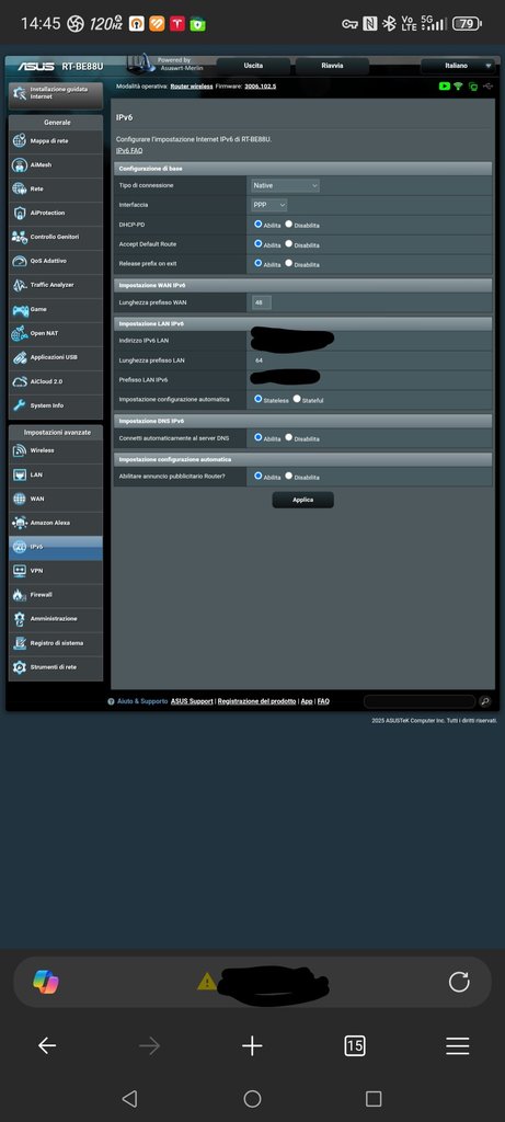 Lascio anche foto allegata con i parametri IPv6 usati fino ad ora, magari sbaglio qualche parametro di configurazione: