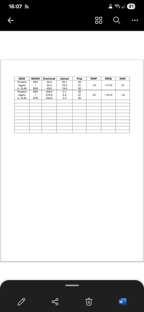 Buongiorno, volevo chiedervi un parere, sto posizionando il mio modem esterno Zyxel NR7302 Outdoor, ho vicino una BTS con N28 che lui capta in automatico, e circa 400 metri dopo una BTS N78 che capta solamente se forzo la selezione bande, vi lascio in allegato i vari dati rilevati nelle due condizioni, cosa pensate sia meglio intermini di stabilità e resa della connessione? Collegato la N78 crolla purtroppo l'upload, ma io per intenderci come uso di internet faccio dello streaming e navigazione, che mi consigliate?
