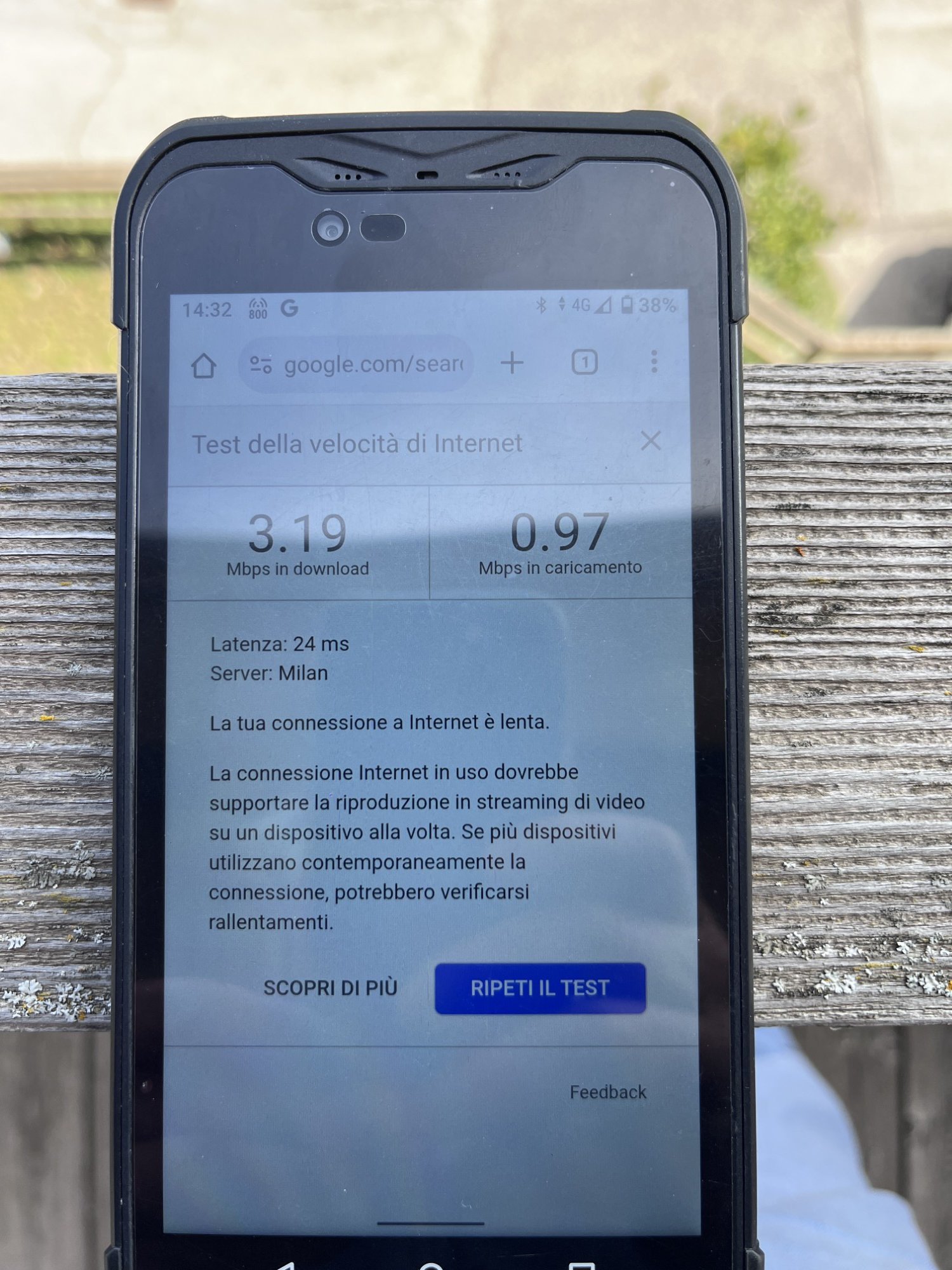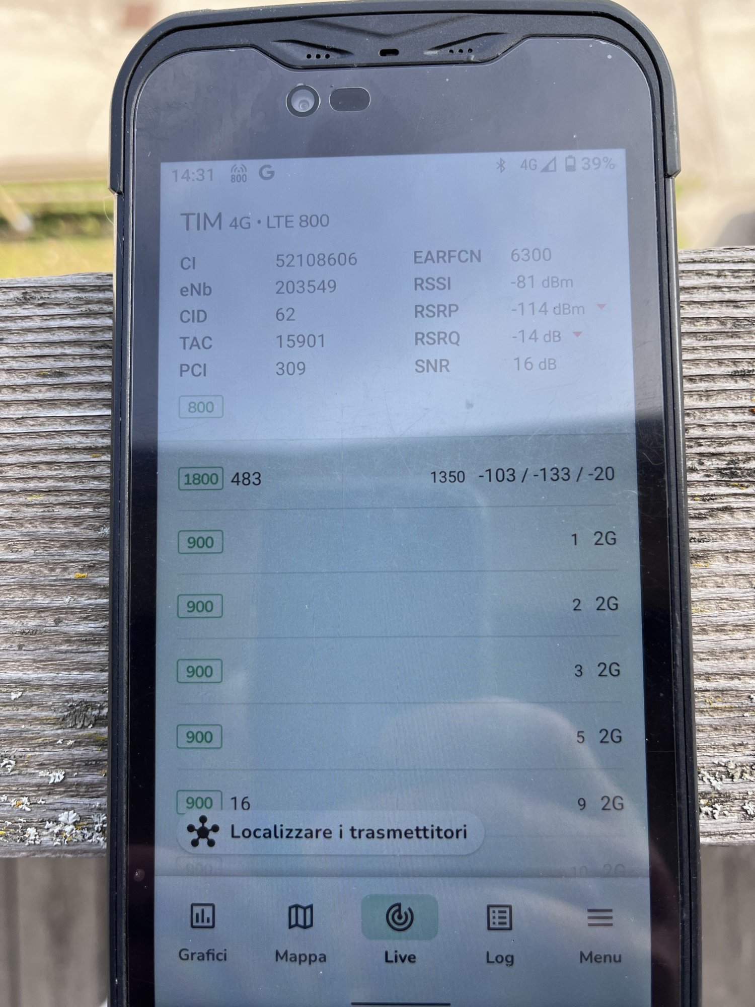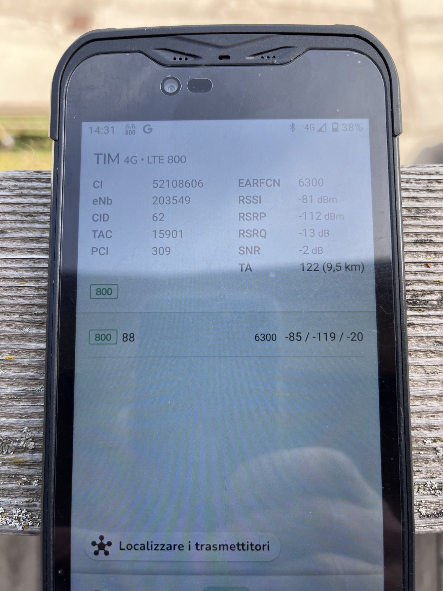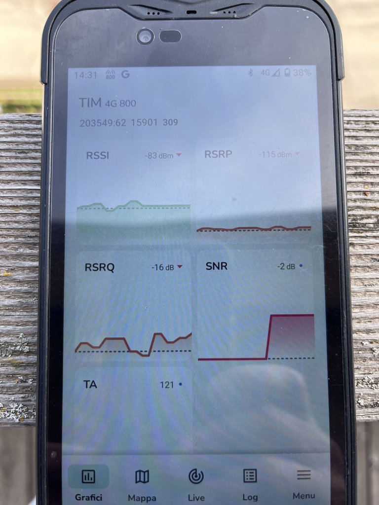 volevo migliorare il segnale internet all'interno di una seconda casa in montagna non coperta da altri operatori (es.Eolo). Ho il ripetitore TIM e VODAFONE a circa 2km ma non è visibile a vista perché è completamente coperto da una collina. Tim emana le Bande B1 B3 B20 B28 mentre Vodafone B7 B1 B3 B20 B28. Dalle prove che ho fatto mi pare che il segnale migliore sia con TIM. Sul poggiolo nel punto più alto della casa (sul tetto è uguale) ho questi segnale:
