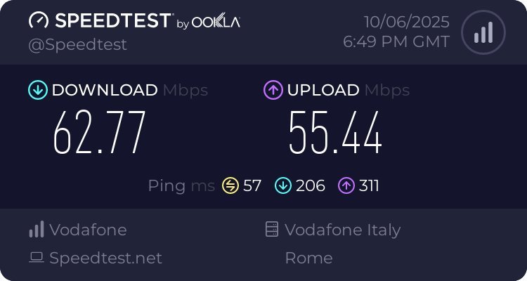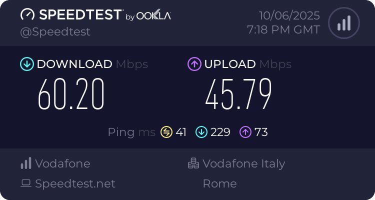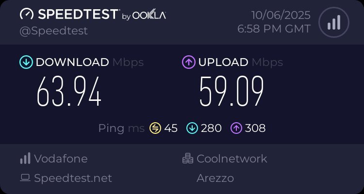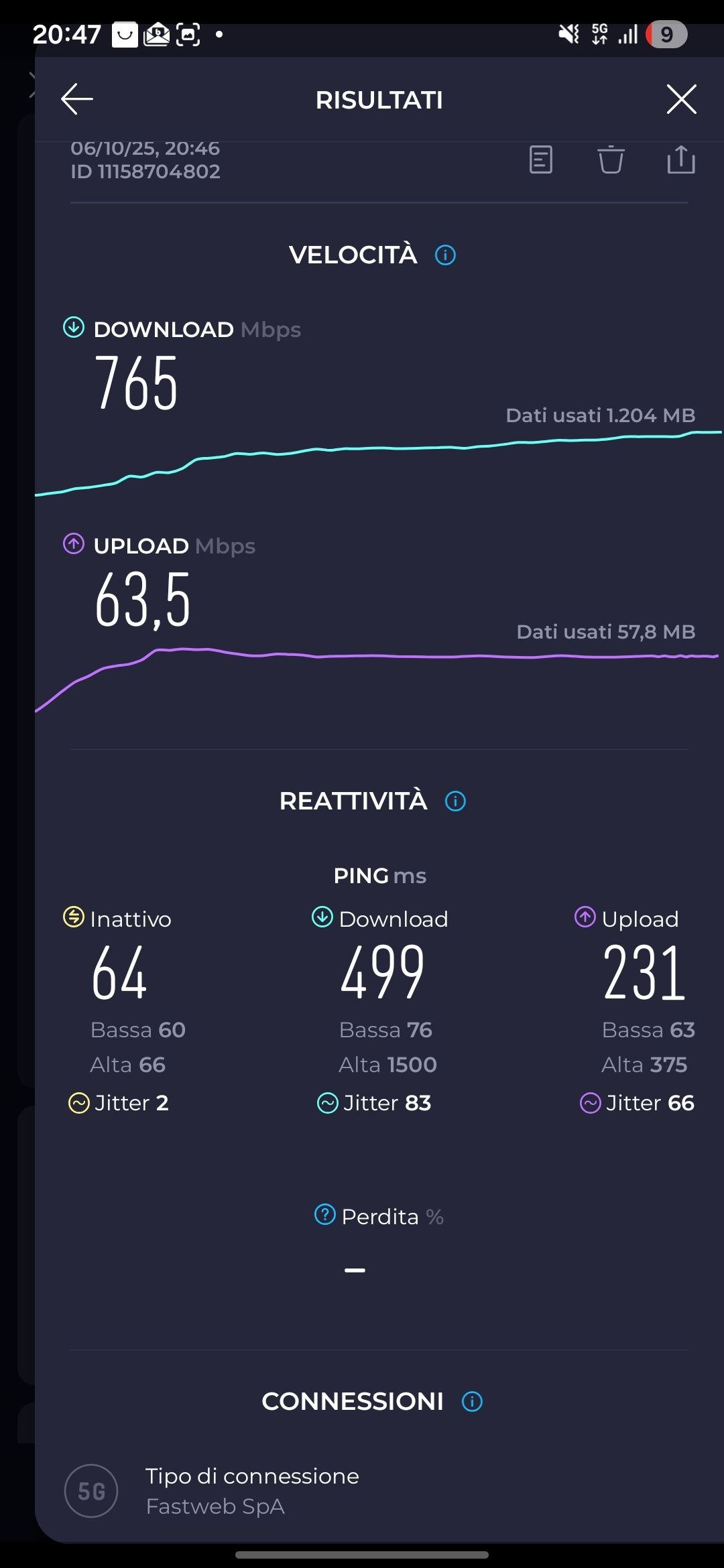 Messo dentro una SIM Fastweb e facendo uno speedtest noto che non supero i 60Mbps.