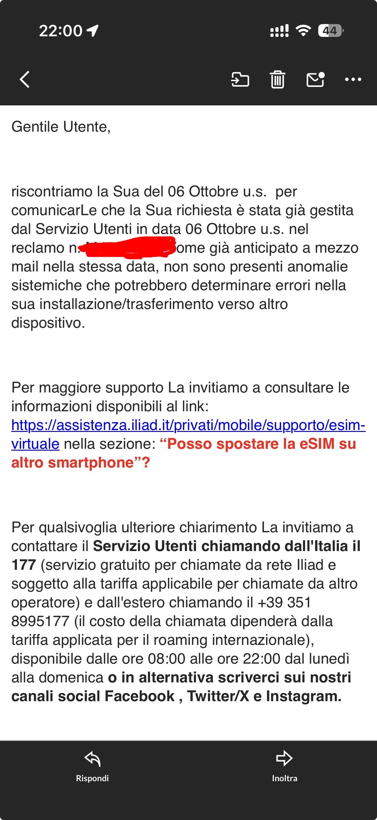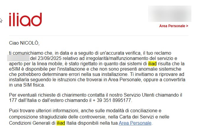 Alla fine ho dovuto aprire una conciliazione, visto che a quanto pare il problema è irrisolvibile. Persino la sostituzione della eSim — anche se a pagamento — non sono in grado di farla. Ho inviato il modulo via PEC, e questa è stata la loro risposta: