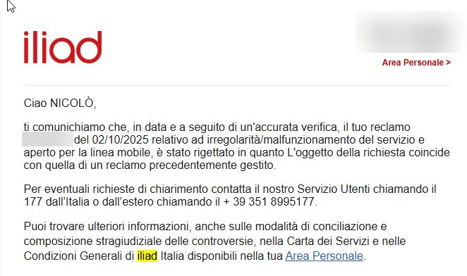 Ho provato anche a mandare una PEC, che ha generato un reclamo da parte di Iliad. Questa la loro risposta, che definire imbarazzante è poco: