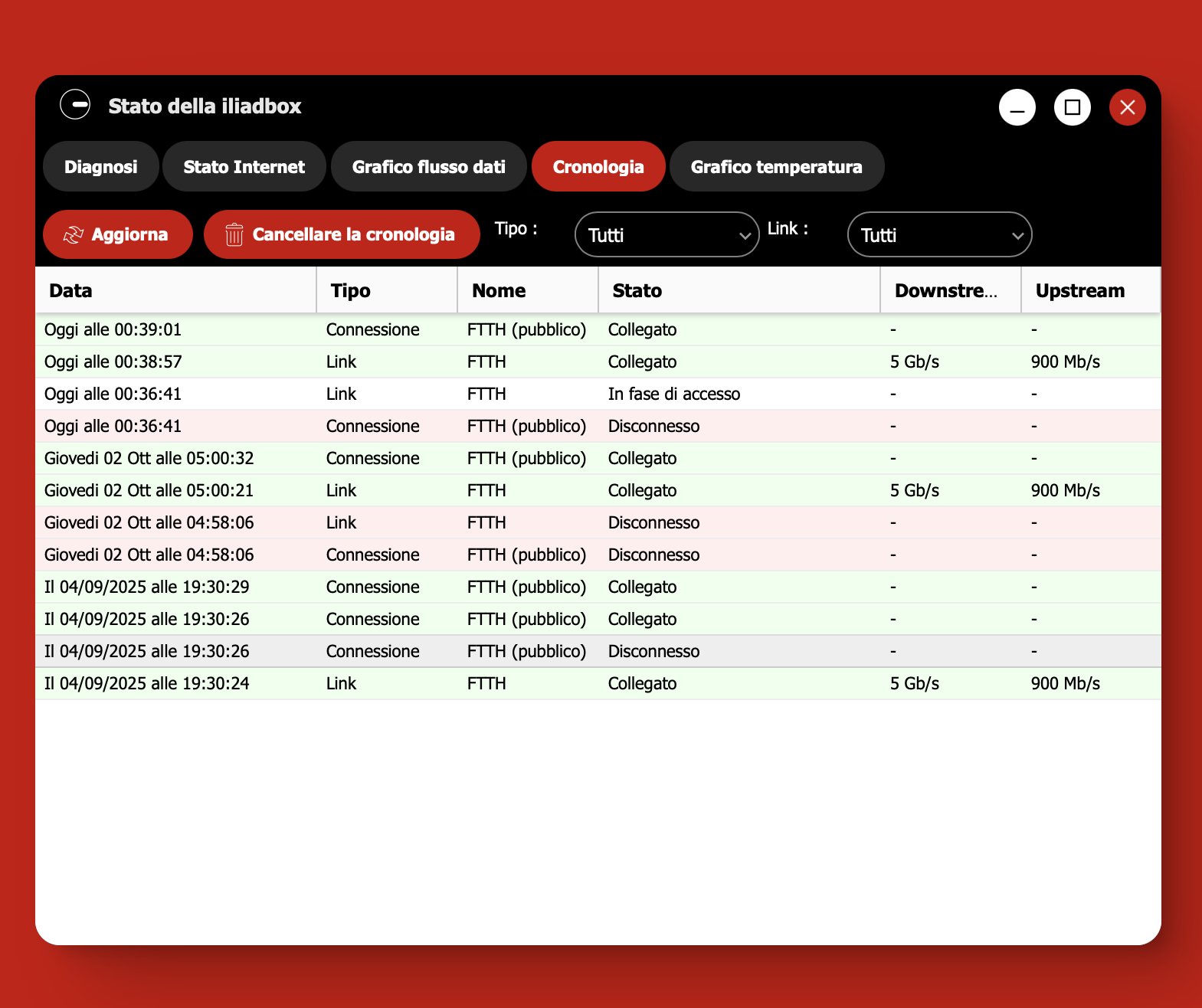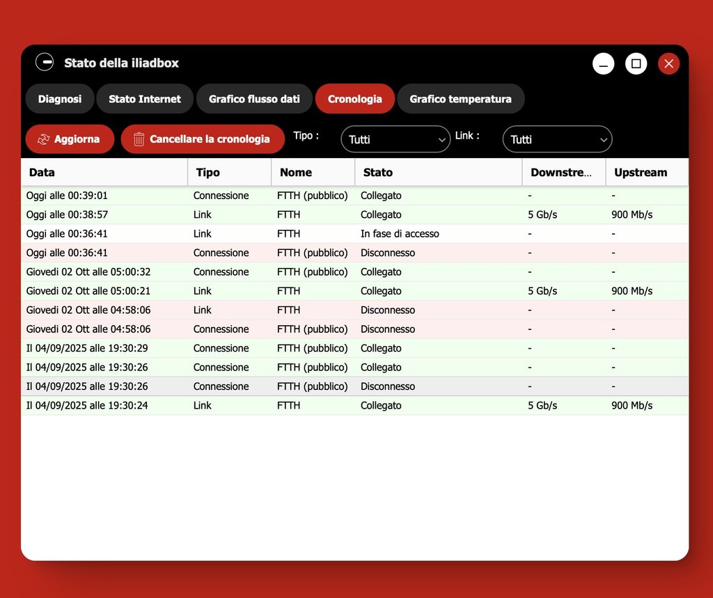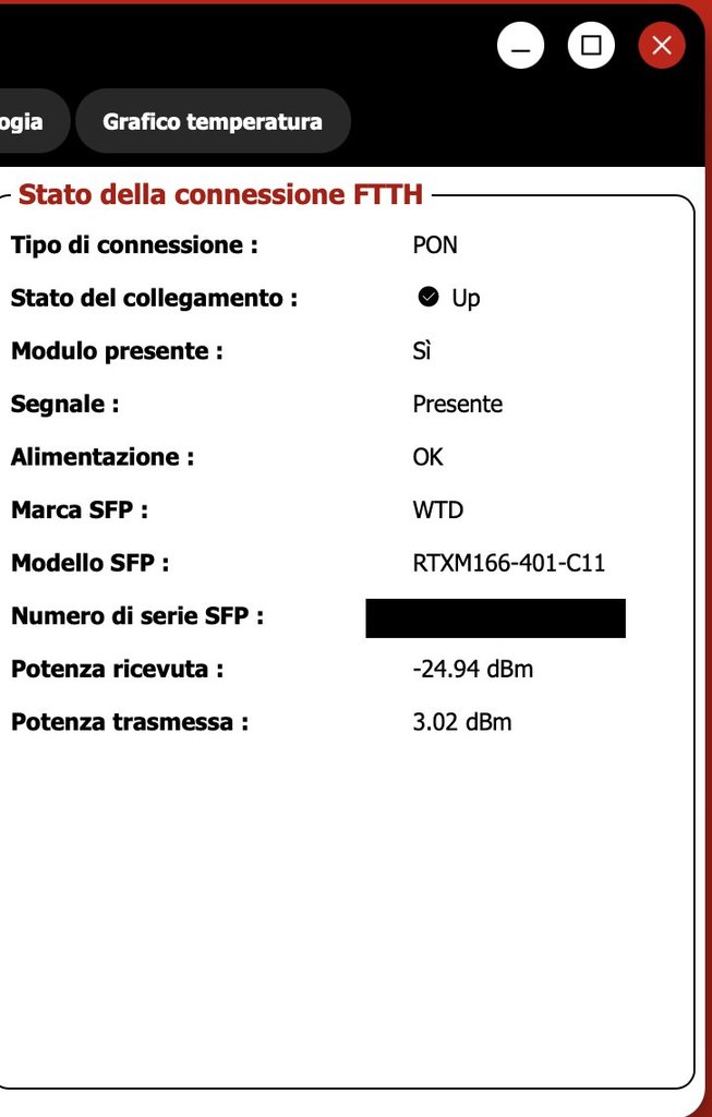 giuse56 Salve a tutti, mi sono accorto che recentemente la mia iliadbox si disconnette ad alcuni orari, cosa che prima non accadeva, secondo voi sono orari di manutenzione apparati/trasporto oppure c'è qualche problema all'OLT? Sono su infrastruttura OF EPON 5G/700 quindi proprietaria ILIAD. I valori ottici sono nei range ottimali, lascio le foto in allegato.