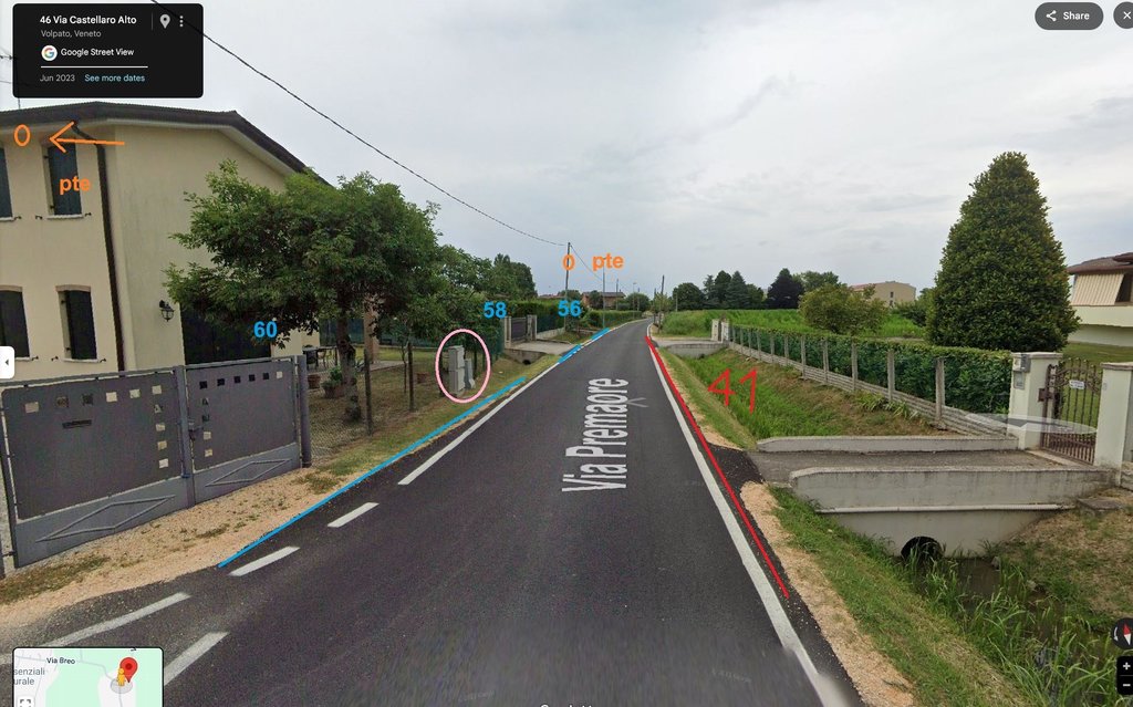 inoltre, se magari qualcuno sapesse in genere come vanno le installazioni, si segue la linea della luce o canaline preesistenti tim? (a tal proposito, al civico 60, segnaot in rosa in foto e' presente un cabinato simet, non nuovo, dove vedevo passare dei microtubi per la fibra e dove dovrebbero passare anche i doppini tim che entrano in casa). essendo che le canaline esterne sono danneggiate e quelle dentro l'abitazione ostruite, volevo sistemare o posare dei nuovi corrugati, sapendo per tempo potrei fare gli scavi con calma nel fine settimana.