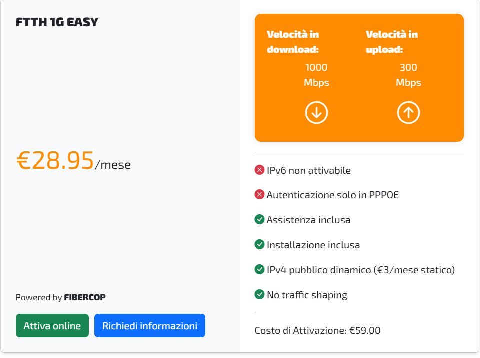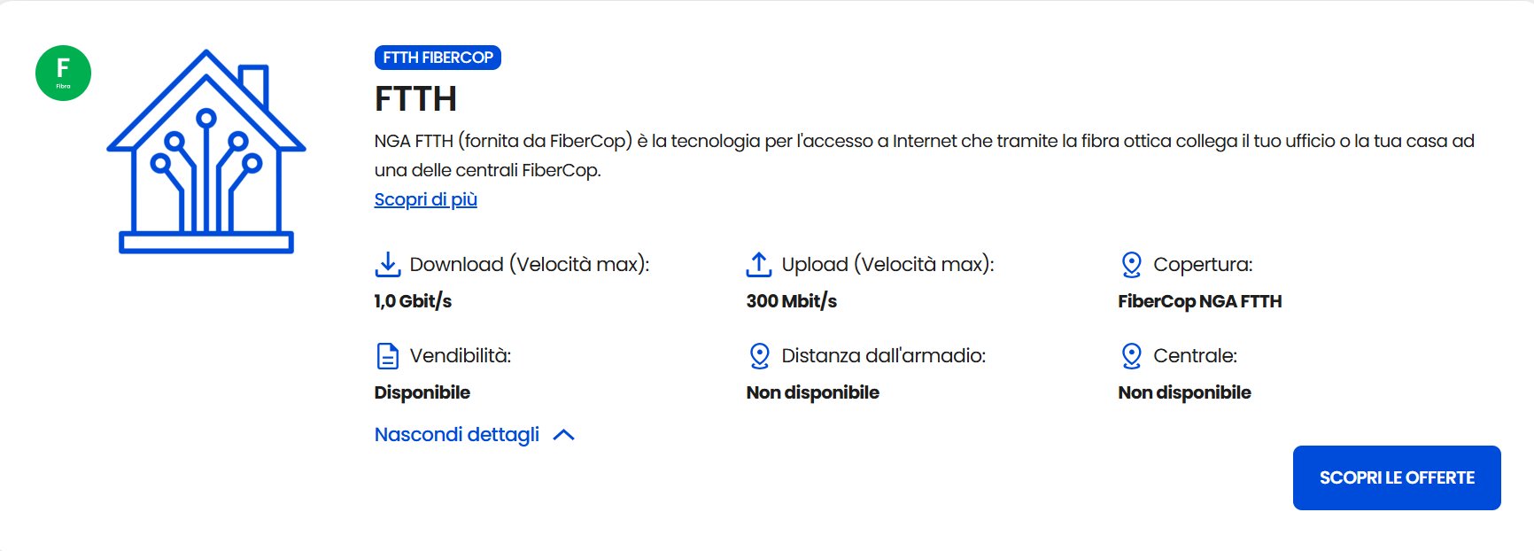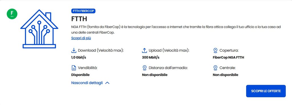 Il problema non rigurda solo il mio civico (dove peraltro ho attiva una FTTH) ma anche altri civici in aree armadio differenti: me ne sono accorto quasi per caso perchè stavo aiutando un amico ad attivare una FTTH ma mi sono accorto del problema. Ho provato allora a fare un po' di verifiche a campione prendendo degli indirizzi dove sono certo che sia attiva l'FTTH di Fibercop (e solo quella) verificando su vari siti di diversi operatori. Questo è il risultato: su alcuni siti risulta disponibile l'FTTH, mentre su altri no (e propongono la misto rame o la FWA).